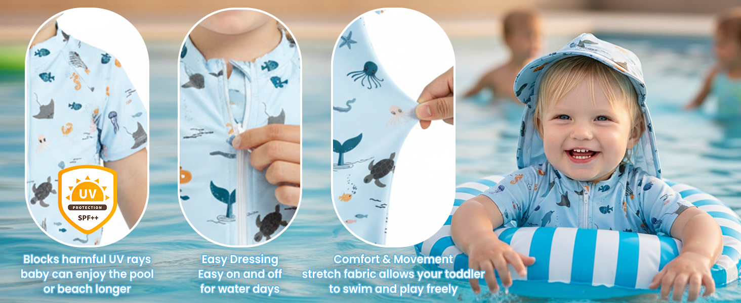 • درع شمس بعامل حماية من الشمس 50+: مصمم كملابس سباحة للأطفال بعامل حماية من الشمس 50+، فهو يحمي البشرة من الأشعة فوق البنفسجية، مثالي للطفل أثناء أيام الشاطئ أو وقت حمام السباحة.