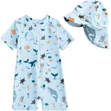 • تصميم مرح مستوحى من المحيط: يتميز بسحاب للإغلاق وطبعات منقوشة لطيفة على شكل ديناصور وسمك القرش/الحوت. تتناسب ملابس السباحة للأطفال الصغار هذه مع قبعة السباحة للحماية من الشمس، مما يجعلها ملابس سباحة يعشقها الأطفال.