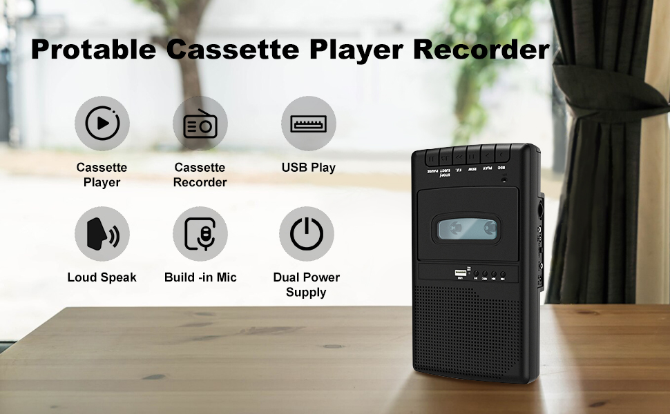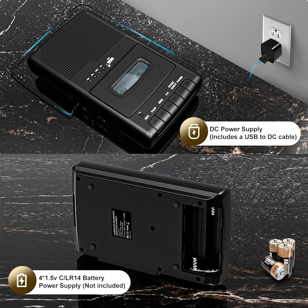 خيارات إمداد الطاقة المزدوجة: يدعم مسجل شريط الكاسيت هذا كلاً من محول التيار المتردد (غير متضمن) وبطاريات 4×C (غير متضمنة)، مما يضمن التشغيل دون انقطاع سواء في الداخل أو الخارج. (يرجى ملاحظة أن المنتج لا يشتمل على محول طاقة وبطارية.)