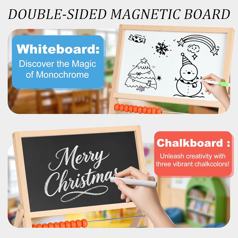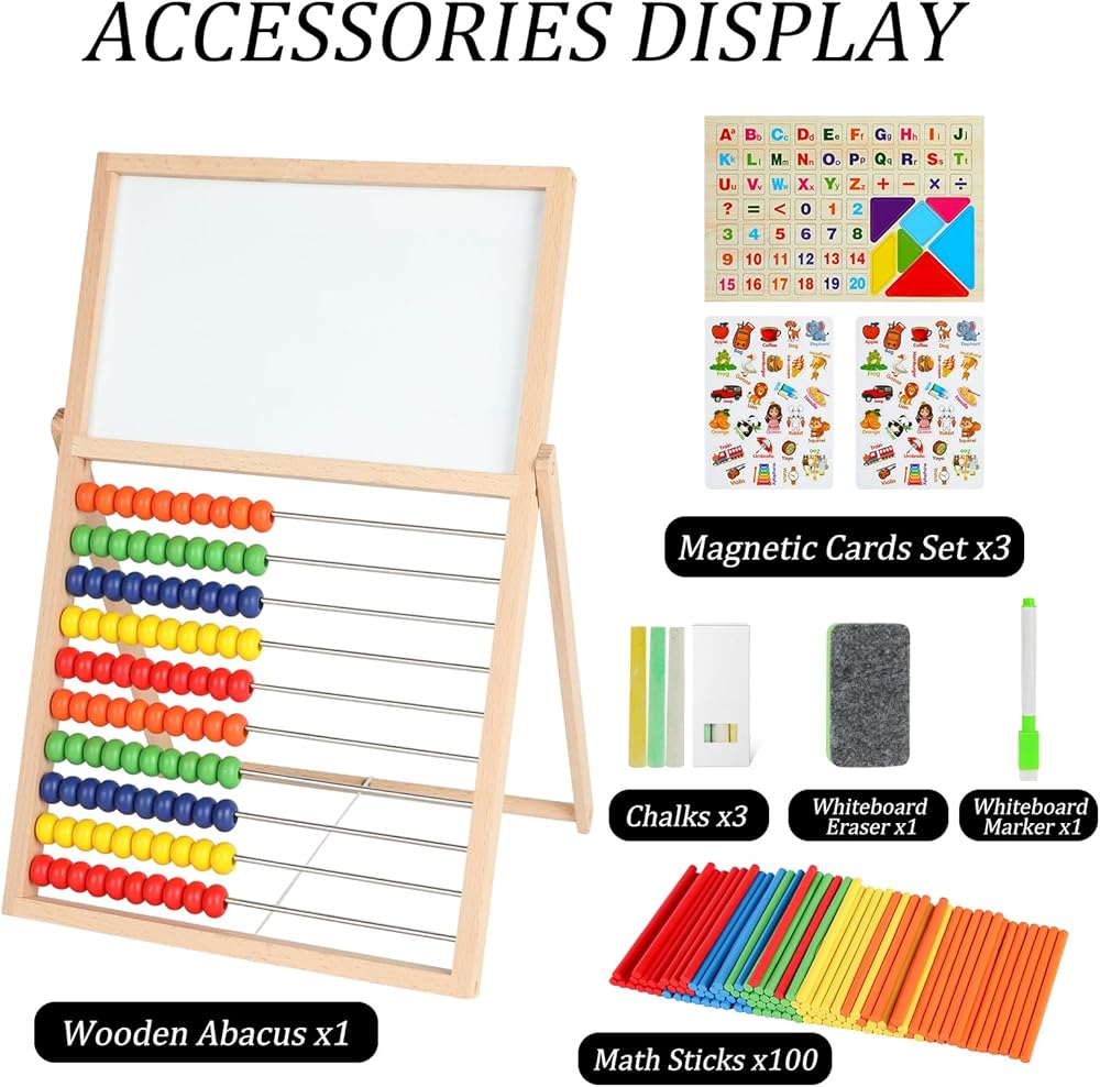 This comprehensive set is your child's first step towards confident learning. The wooden abacus demystifies early math concepts, while the magnetic letters and numbers build pre-reading and spelling skills. The double-sided board becomes a canvas for creativity or a practice slate for equations. With the included geometric magnets and cognitive clock, children can naturally advance to understanding shapes, patterns, and the basics of telling time.