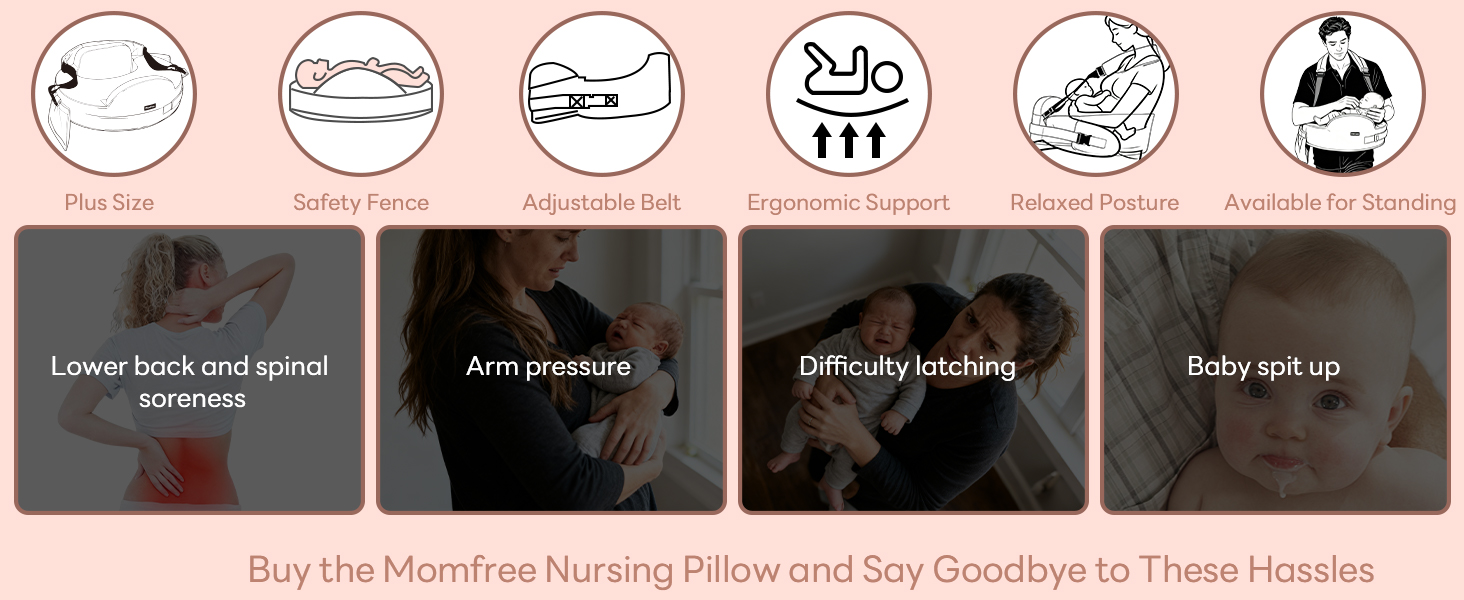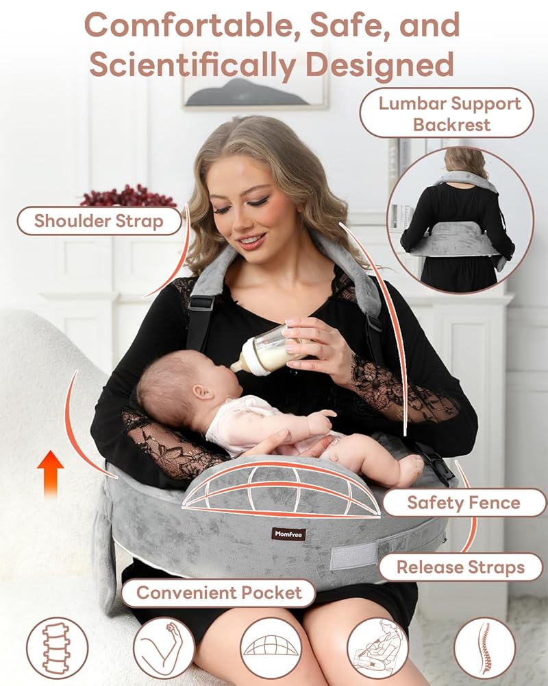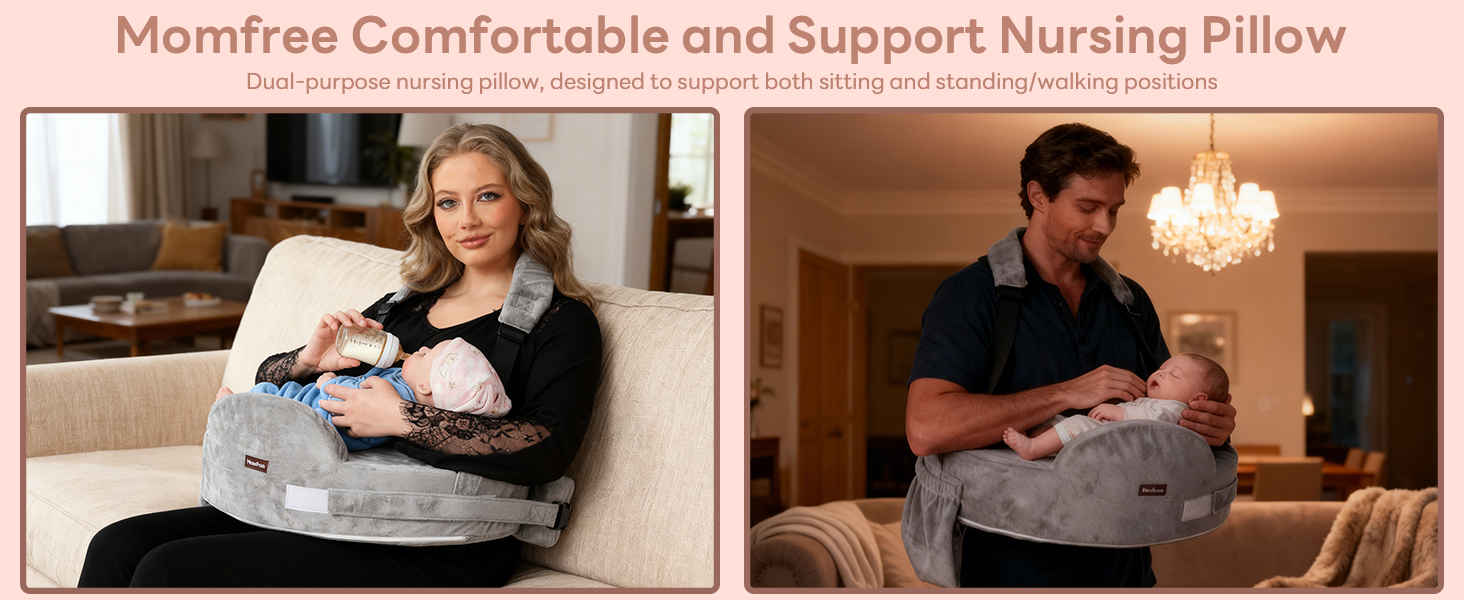 • 【Free-Moving Breastfeeding】 Momfree Nursing Pillow Redefines Breastfeeding Freedom !!! Traditional nursing pillows “lock” you to your sofa or bed, restricting your movement. Understanding the challenges faced by nursing parents, we've developed the first nursing pillow with a neck strap. The neck strap and waist belt securely fasten the nursing pillow to your body, providing stable support for both your baby and your arms. This allows you to nurse your baby while standing or walking, or gently pat them to sleep.
