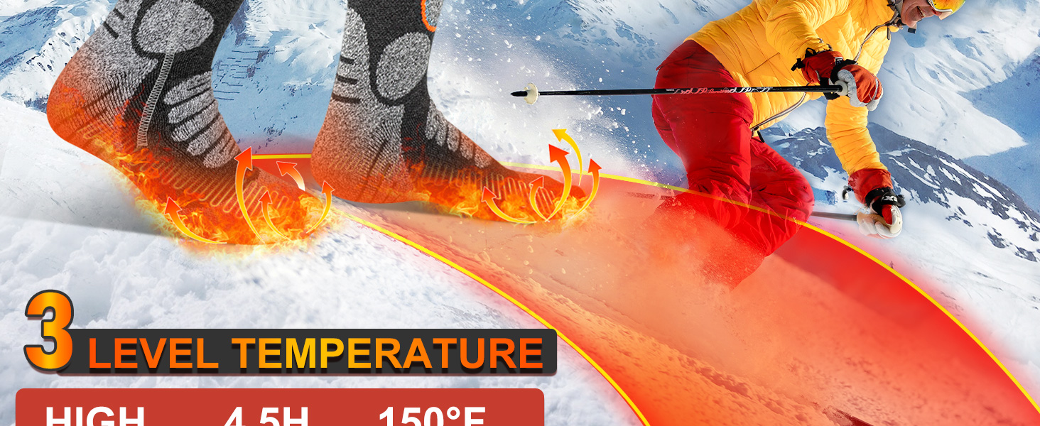 【3 Levels Temperature Adjustable】Heated socks feature 3 temperature levels. You can easily select the ideal temperature by short press the temperature setting button. According to weather conditions and your personal preferences, you can set the socks to low temperature (40⁰C/104⁰F), medium temperature (50⁰C/122⁰F) and high temperature (65⁰C/149°F).