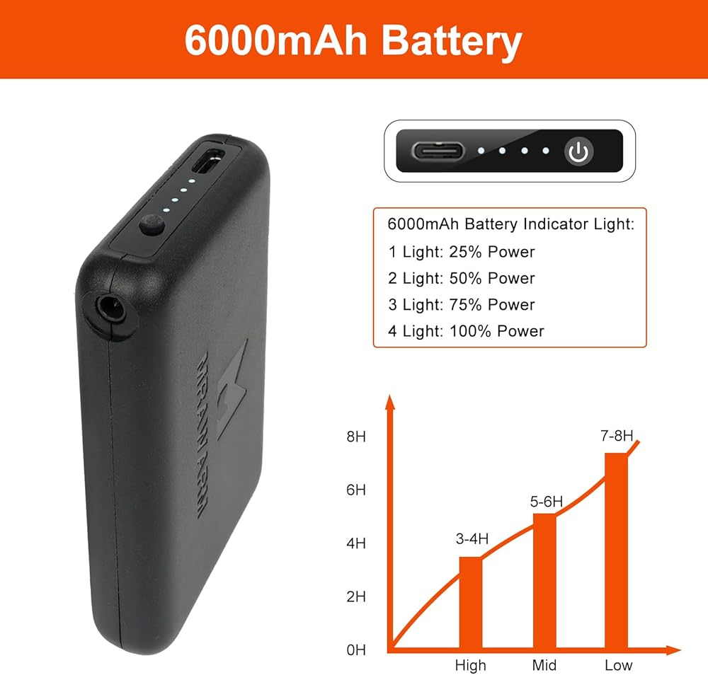 【Large Capacity Battery】Compared with other heated socks with 5000mAh batteries, our heated socks are equipped with 5V 6000mAh rechargeable batteries. Electric socks provide up to 9 hours of continuous warmth on the lowest setting and about 4 hours of warmth on the highest setting when fully charged, keeping you warm all day.