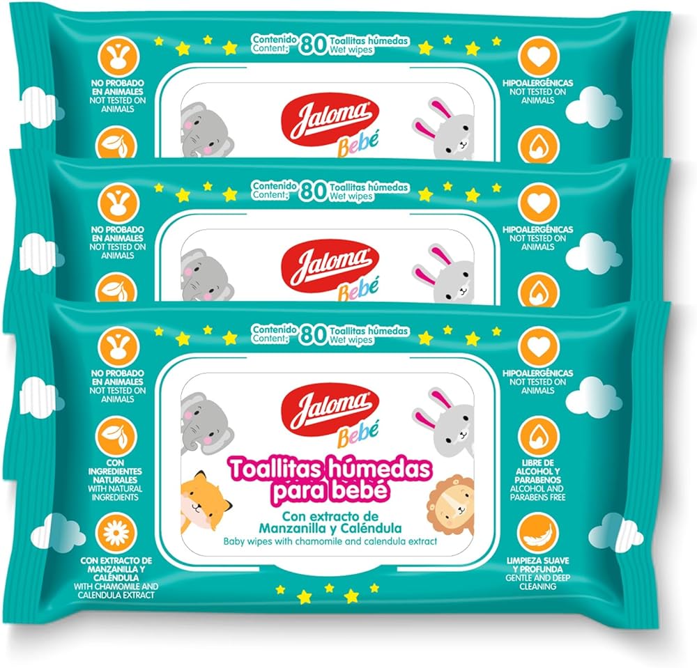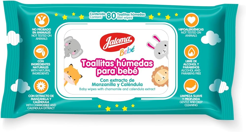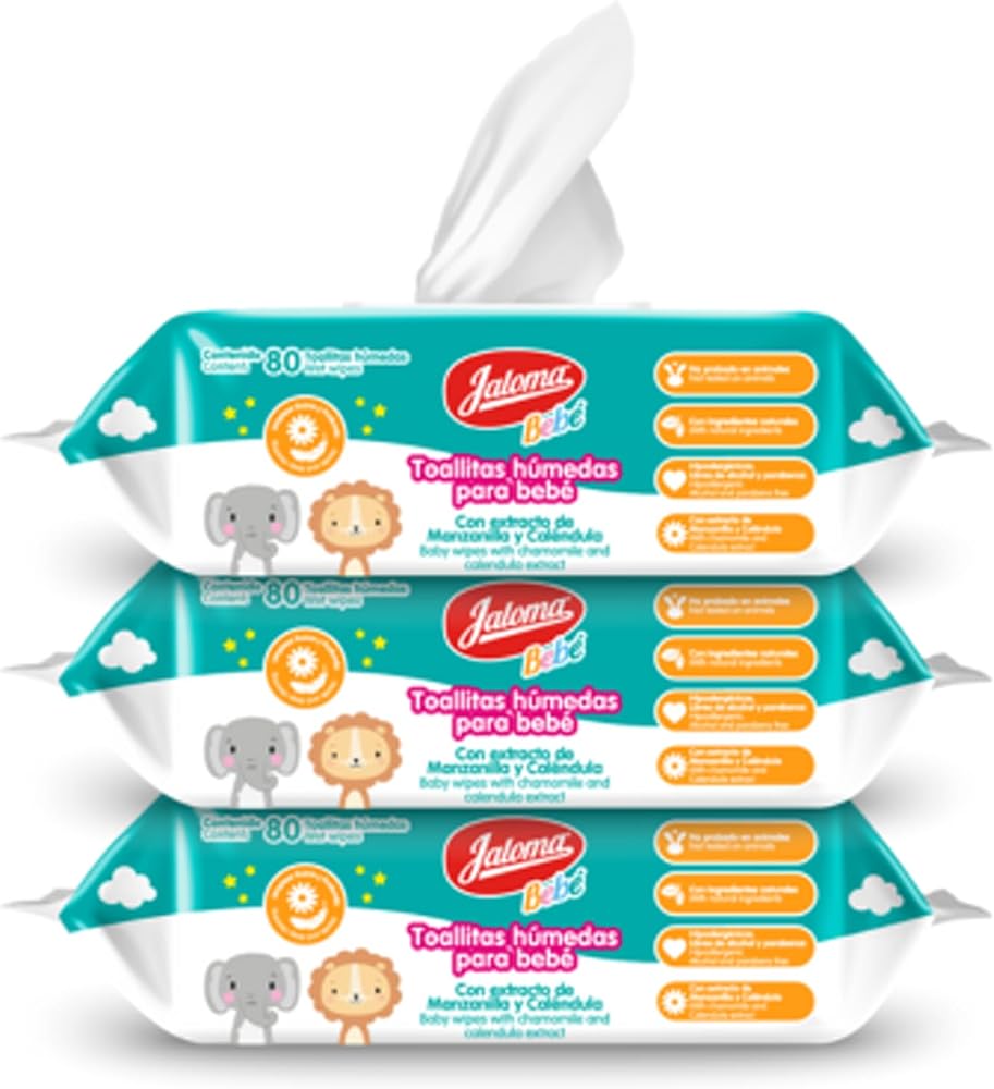 Keep your baby's skin clean, fresh, and protected with Jaloma Baby Wipes. Enriched with soothing chamomile and nourishing calendula extracts, these gentle wipes are specially formulated to care for delicate skin. The soft, durable fabric provides an effective yet tender cleanse, leaving skin feeling refreshed without irritation. Perfect for diaper changes, mealtime cleanups, or on-the-go messes, Jaloma Baby Wipes are alcohol-free, dermatologically tested, and safe for daily use. With the natural calming properties of chamomile and the moisturizing benefits of calendula, each wipe helps protect your baby's skin from dryness while keeping it soft and smooth.