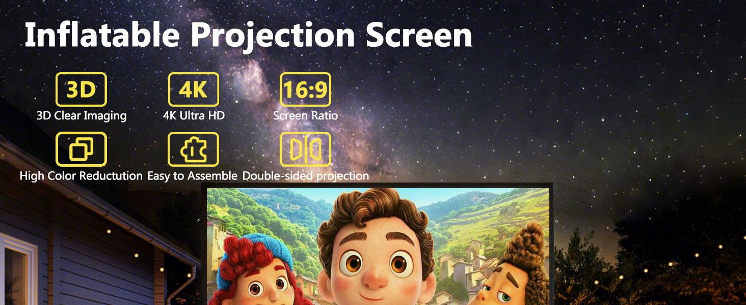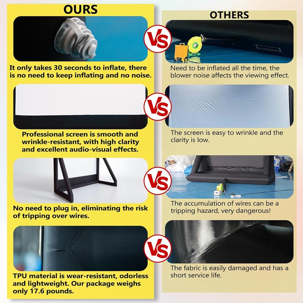 【إطار وشاشة مقاومة للماء】: إطار مصنوع من مشمع TPU مع تقنية الهواء المختوم (لا حاجة للنفخ بشكل مستمر، لا ضوضاء، مثبطات اللهب، مقاومة للماء ومقاومة التآكل)؛ شاشة عرض قابلة للنفخ مصنوعة من مادة حرير الحليب الفاخرة القابلة للغسل والتي تضمن تجربة خالية من التجاعيد؛ مع شاشة الأفلام القابلة للنفخ، يمكنك مشاركة أفلامك المفضلة مع الأصدقاء والعائلة في الفناء الخلفي أو الحديقة أو بجوار حمام السباحة. إنه الخيار الأفضل لأداء العمل، أو حفلات الشاطئ، أو حفلات الشواء في الهواء الطلق، أو التخييم، أو أعياد الميلاد، أو حفلات الزفاف.