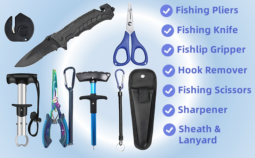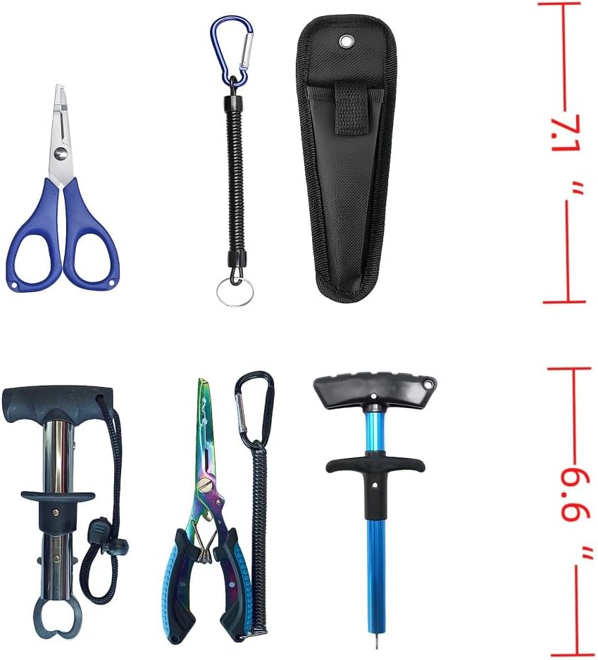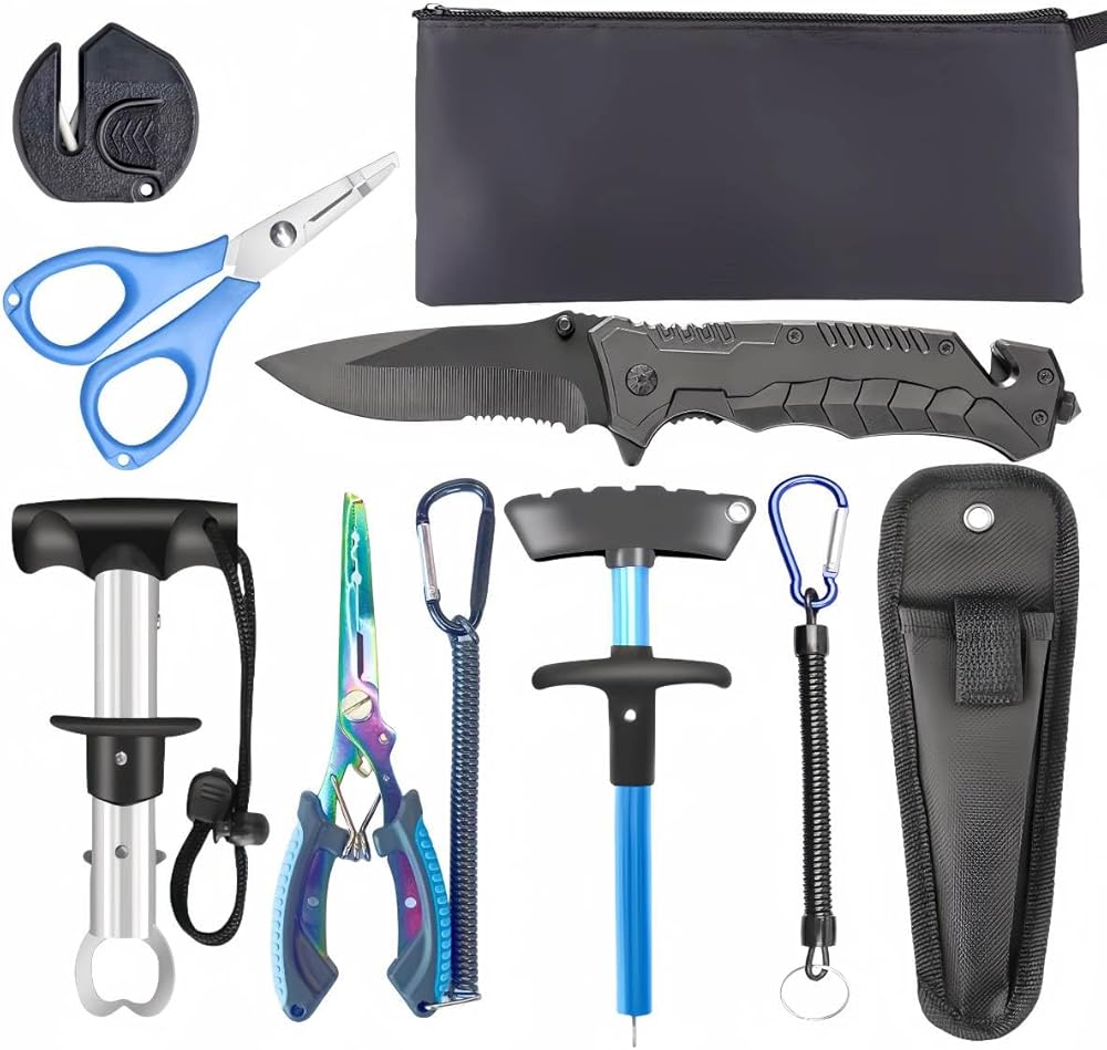 مجموعة أدوات الصيد القابلة للجيب داخل علبة من النايلون - مجموعة أدوات صيد محمولة حقًا مصممة لتوفير الراحة أثناء الصيد أو الخوض. تشتمل أدوات الصيد المكونة من 8 قطع على كماشة صيد متعددة الوظائف من الفولاذ المقاوم للصدأ عالية الجودة (6.5 بوصة)، وسكين صيد قابل للطي (4.9 بوصة مطوية)، ومقبض شفاه سمكة (6.5 بوصة)، ومزيل خطاف من سبائك الألومنيوم (6.7 بوصة)، ومقص صيد متعدد الوظائف SS (3.9 بوصة)، ومبراة سكين (2.2 بوصة)، وغمد، وأحبال