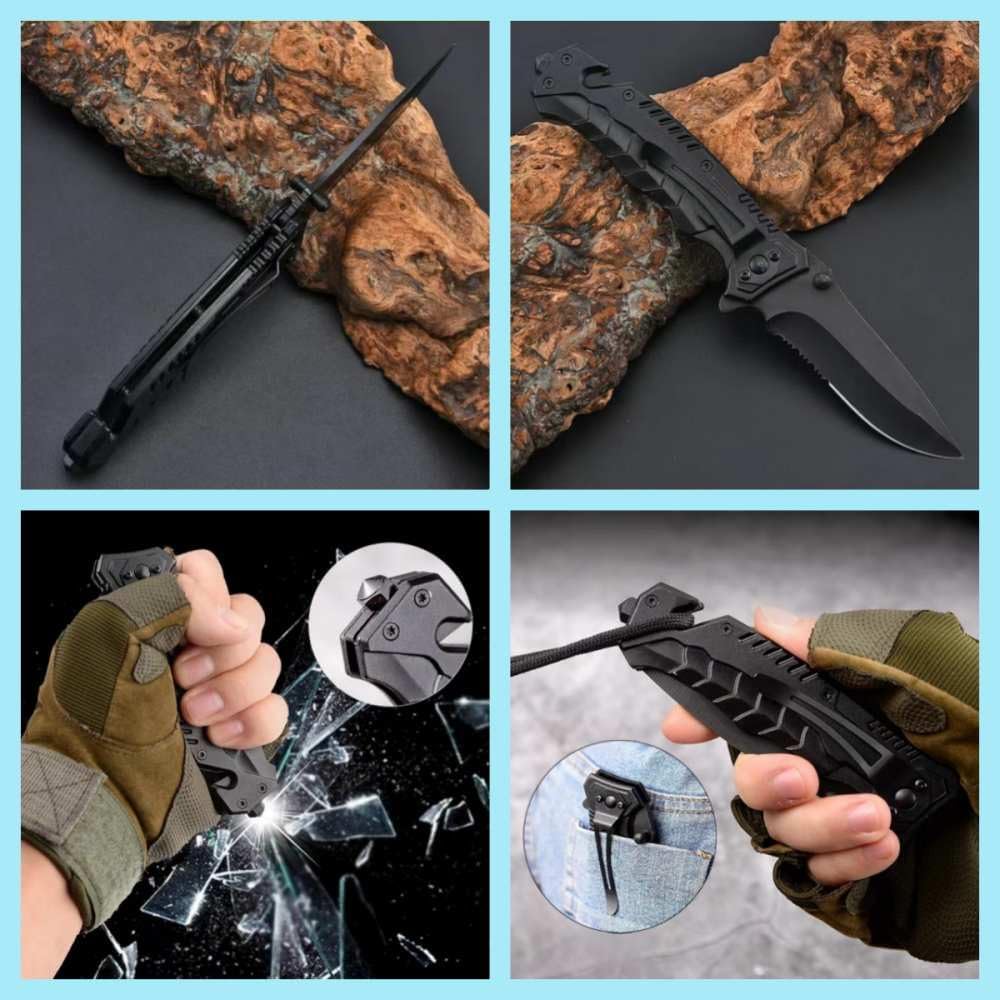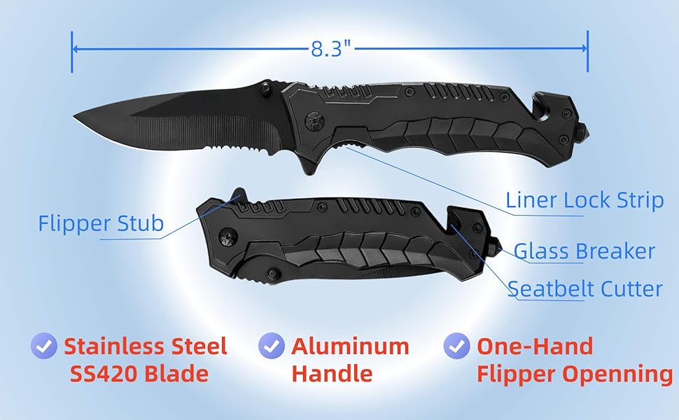 سكين صيد متعدد الوظائف قابل للطي - مصنوع من الفولاذ المقاوم للصدأ SS420C القوي، ويتميز سكين الصيد المطلي باللون الأسود المسنن جزئيًا بفتحة زعنفة بيد واحدة ونظام قفل بطانة آمن. مثالية لصيد الأسماك أو قطع الحبال أو الاستخدام العام في الهواء الطلق - آمنة ومريحة للحمل أثناء الصيد أو المشي لمسافات طويلة