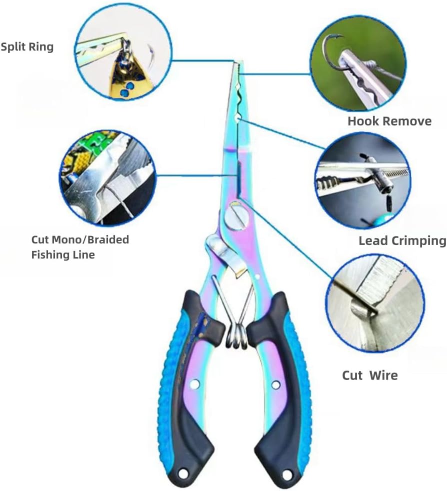 كماشة صيد متينة ومقاومة للتآكل - مصنوعة من الفولاذ المقاوم للصدأ مع لمسة نهائية مطلية بالتيتانيوم لتعزيز مقاومة الصدأ. هذه الكماشات متعددة الاستخدامات تقطع بسهولة خطوط الصيد الأحادية والمضفرة والفولاذية، وتجعيد أوزان الرصاص، وتقسم الحلقات المزدوجة، وتزيل خطافات الصيد بسهولة.