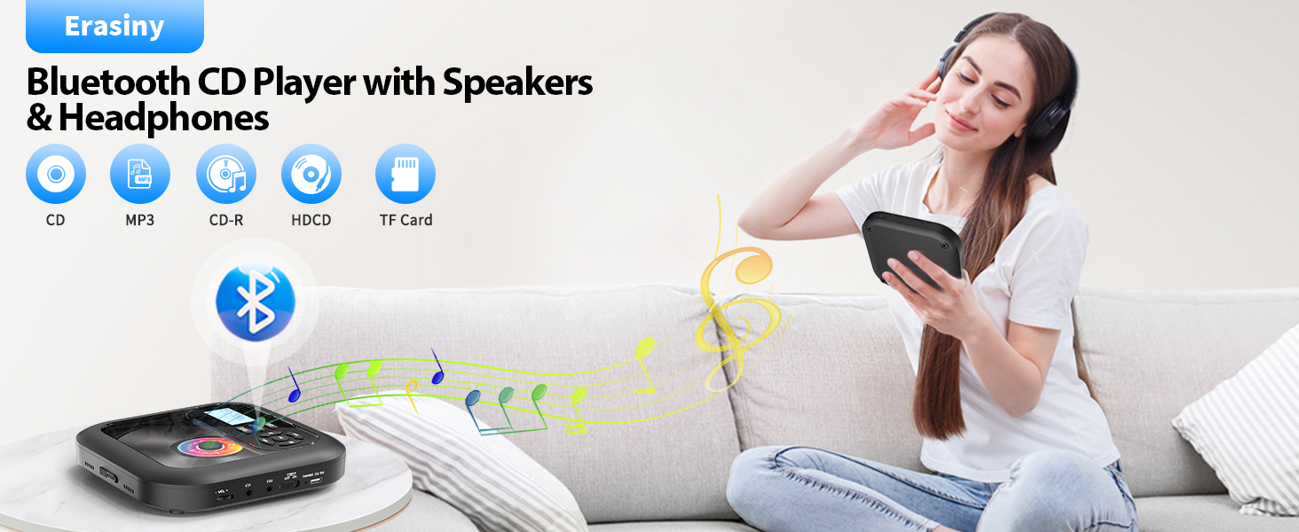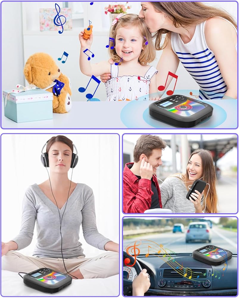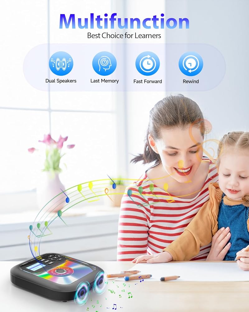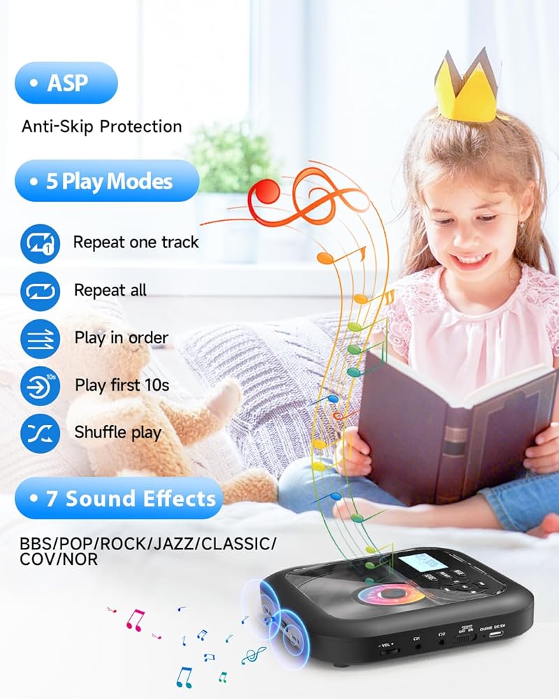 وظائف متعددة لاحتياجات متعددة: مجهزة بـ 7 أوضاع EQ و5 أوضاع تشغيل، تتكيف مع أنواع الموسيقى المختلفة وتفضيلات الاستماع. يدعم بطاقة TF (بطاقة SD صغيرة) وتسجيل بطاقة CD-to-TF، مما يسمح لك بتخزين الموسيقى المفضلة على بطاقة صغيرة لتسهيل حملها في الهواء الطلق. تعد وظيفة التكرار A-B أداة عملية لتعلم اللغة أو ممارسة الموسيقى أو حفظ المحتوى الرئيسي.