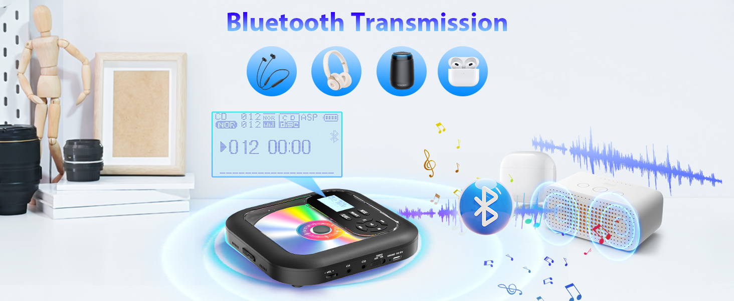 جهاز إرسال بلوتوث للاستماع اللاسلكي: يتميز مشغل الأقراص المضغوطة هذا بوظيفة إرسال بلوتوث، والتي تقترن بسلاسة مع سماعات الرأس ومكبرات الصوت وأجهزة استقبال البلوتوث الأخرى للصوت اللاسلكي. ملاحظة: لا يمكن الاتصال بالسيارات أو الهواتف أو أجهزة الكمبيوتر المحمولة مباشرة. يمكنك استخدام كابل AUX لاستخدامه في السيارة