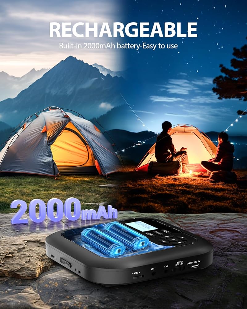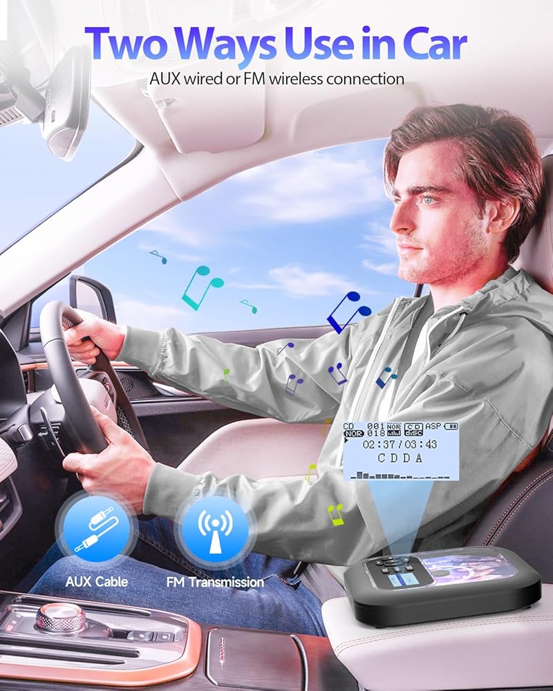 بطارية قابلة لإعادة الشحن للاستخدام أثناء التنقل: استمتع بمشغل الأقراص المضغوطة المحمول هذا بدون سلك في الهواء الطلق أو في المنزل أو في الرحلات باستخدام البطارية المدمجة القابلة لإعادة الشحن، دون الحاجة إلى بطاريات يمكن التخلص منها. يمكن إعادة الشحن بسهولة عبر منفذ USB للسيارة للرحلات البرية أو الأنشطة الخارجية، وهو مثالي للسفر والتنقلات اليومية