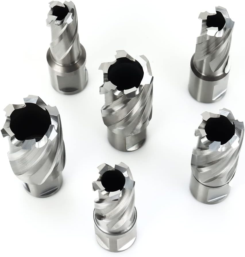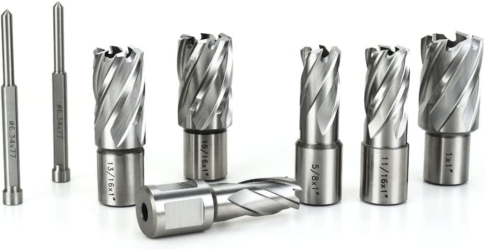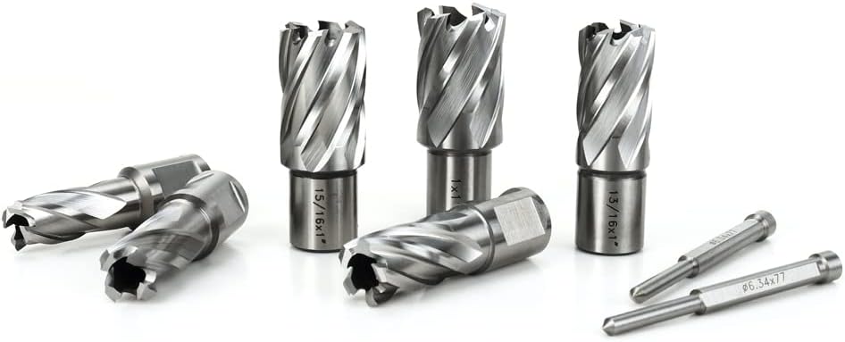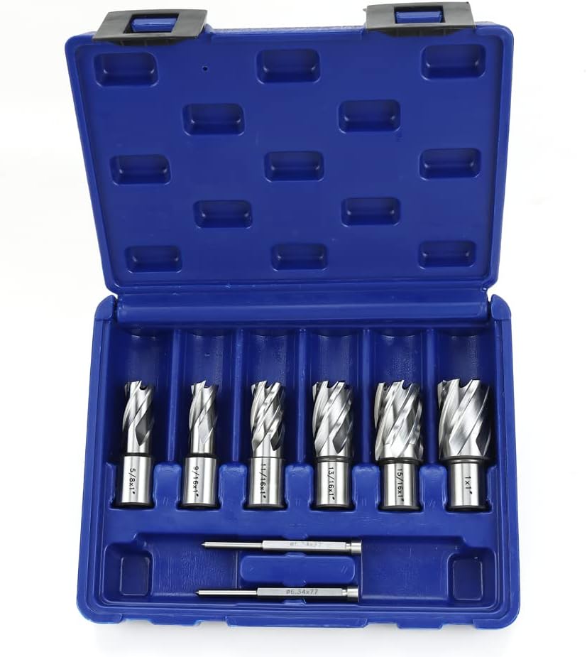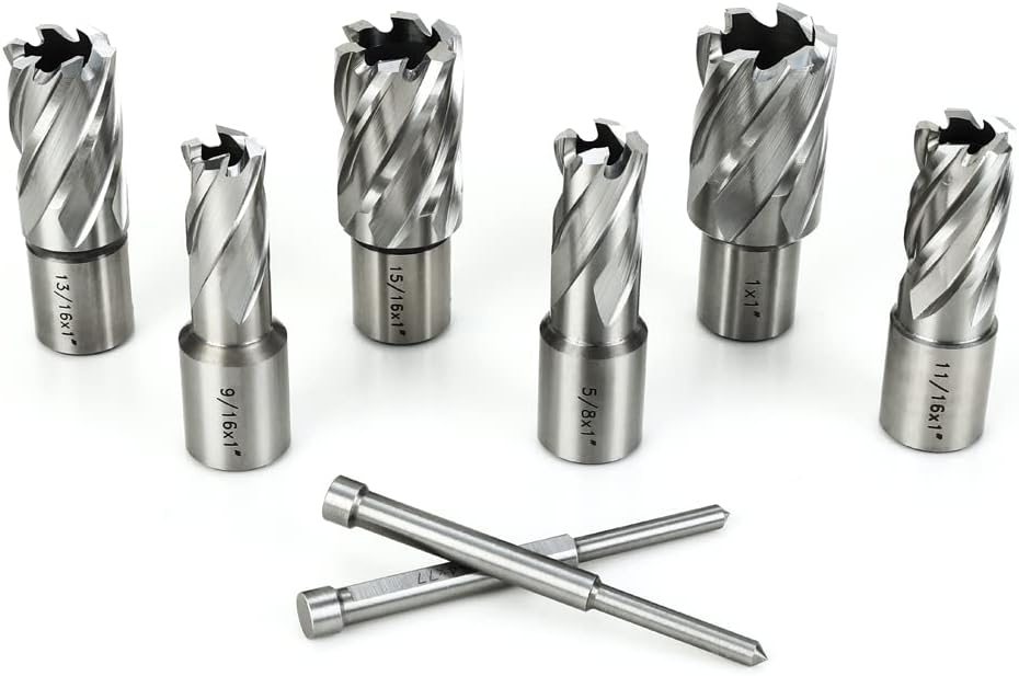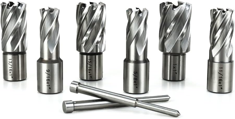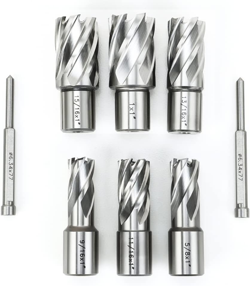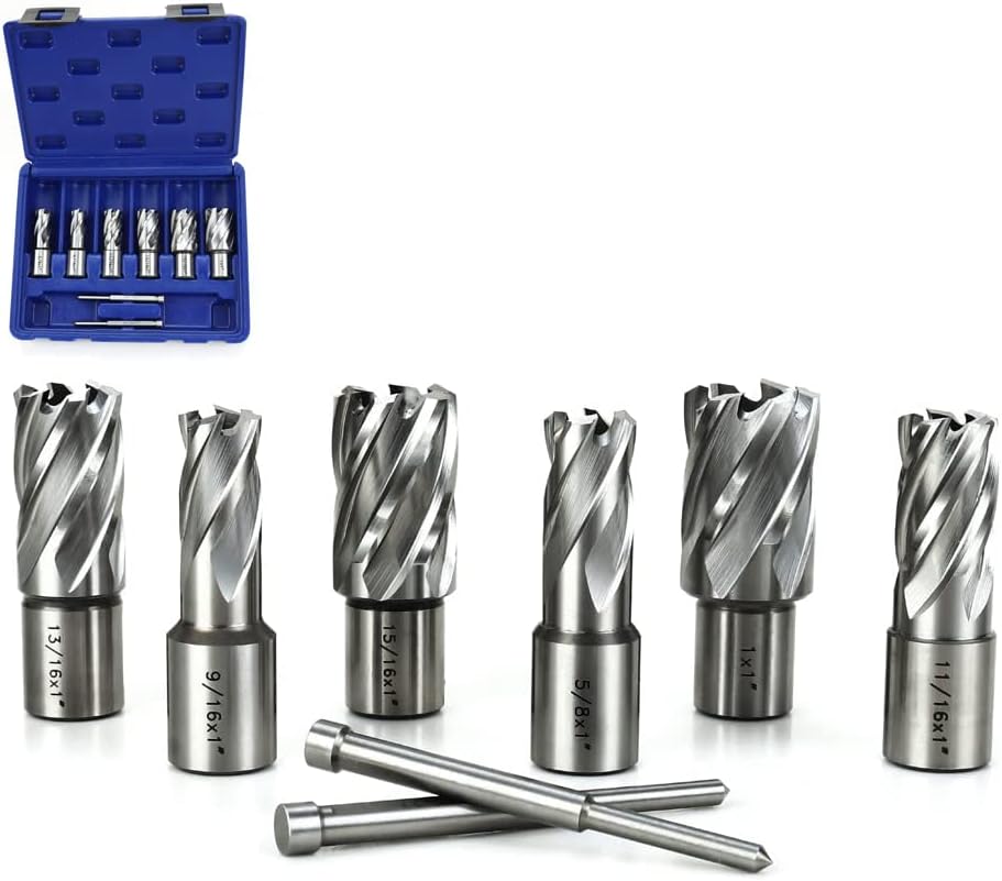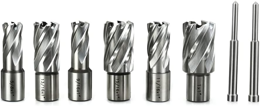 Annular Cutter Kit includes 6 pcs high speed steel annular cutters,1"Cutting Depth,Cutting Diameter(9/16", 5/8'', 11/16'', 13/16'',15/16'', 1“) and 2pcs pilot pins.