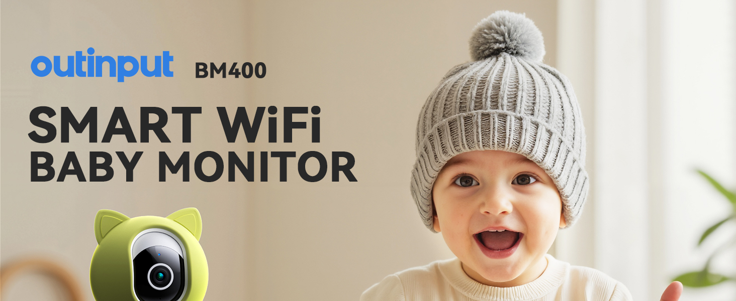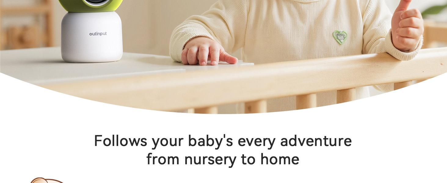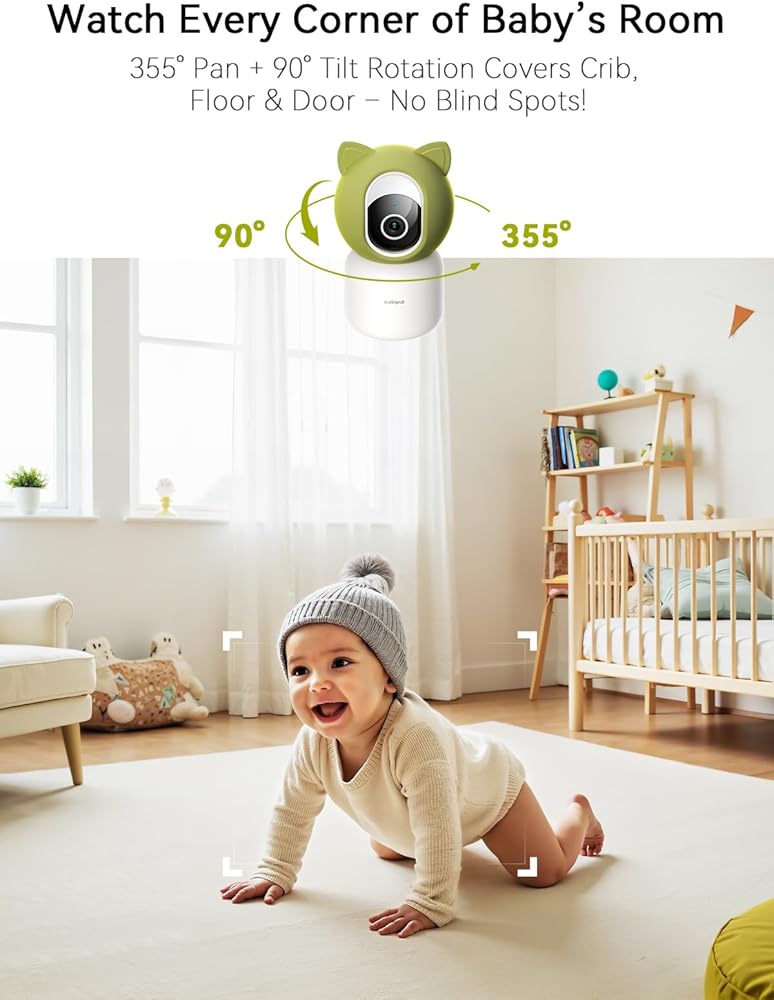 جهاز مراقبة الطفل Outinput مع الكاميرا والصوت، كاميرا أمان داخلية 2K 4MP للمنزل، 360 درجة PTZ، تنبيهات الذكاء الاصطناعي للبكاء والتغذية، رؤية ليلية مع ضوء لطيف، تهويدات مهدئة، صوت ثنائي الاتجاه