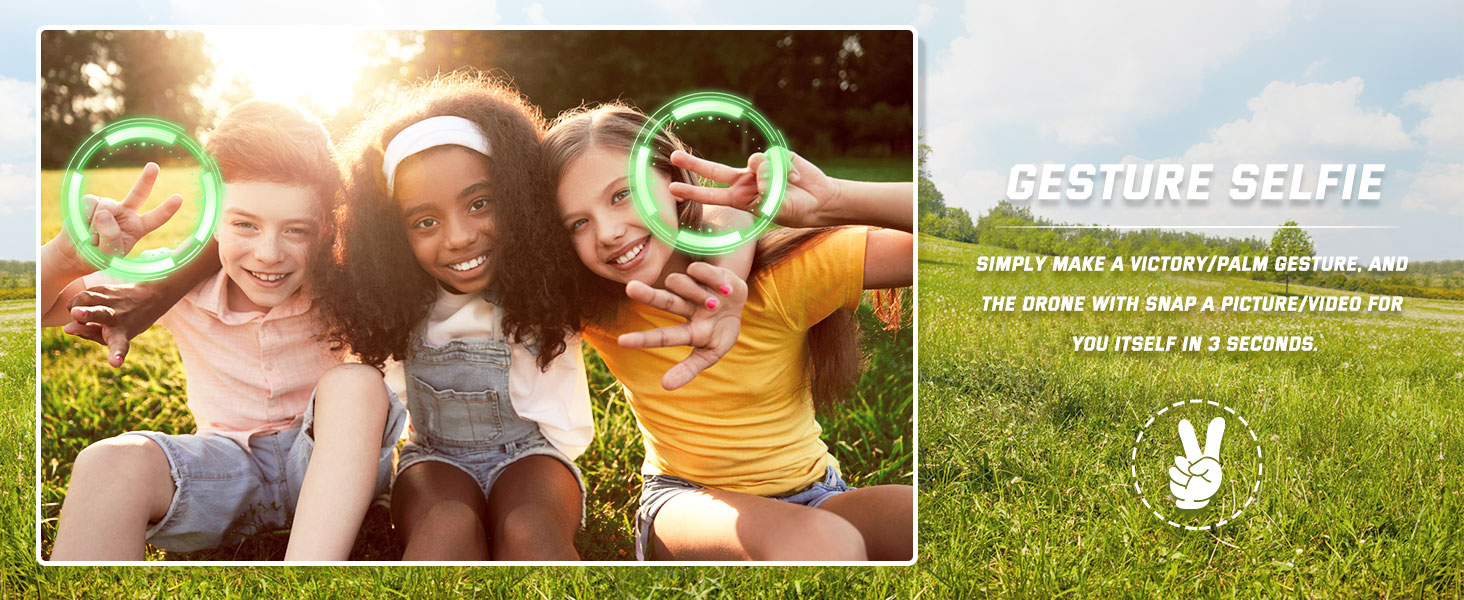 مستشعر الجاذبية والتعرف على الإيماءات: تحت وضع الجاذبية، ستتبع الطائرة بدون طيار الاتجاه الذي تقوم بإمالة هاتفك الذكي. تحديد إيماءات "V" أو "Palm" المحددة لالتقاط الصور أو مقاطع الفيديو في غضون 3 ثوانٍ، بدون استخدام اليدين لالتقاط لقطات رائعة