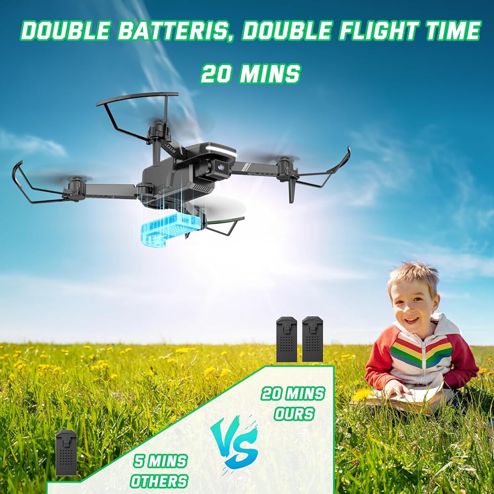 جسم قابل للطي وحجم صغير: هذا التصميم يجعل هذه الطائرة بدون طيار التي تعمل بالتحكم عن بعد مع الكاميرا مدمجة ومحمولة، وسهلة الحمل في الهواء الطلق والاستمتاع بكل وقت فريد مع الأصدقاء. توفر البطاريات المعيارية المزدوجة 16-18 دقيقة من وقت الطيران في الداخل/الخارج