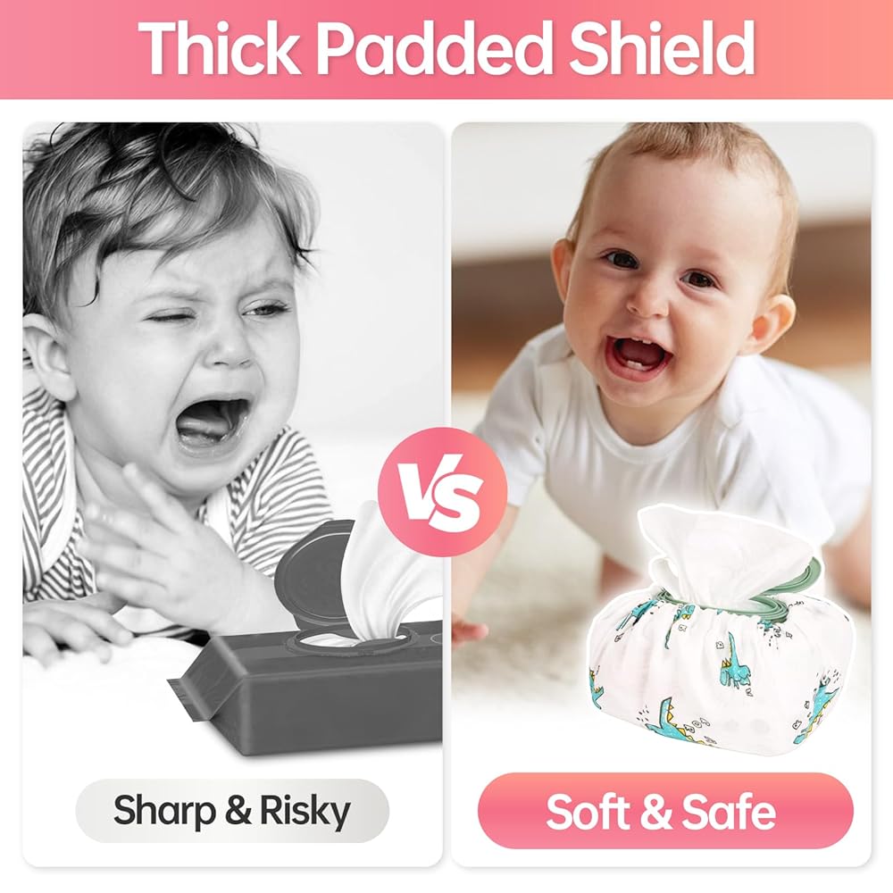 • Ultimate Safety with Thick Padded Shield: Transform your standard wet wipe packs into a soft & safe accessory. Our Baby Wipes Cover features a thick, padded design that cushions sharp plastic edges and hard corners of disposable wipe packs, protecting your little one's delicate skin during diaper changes or playtime.