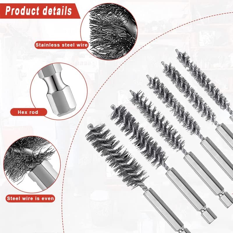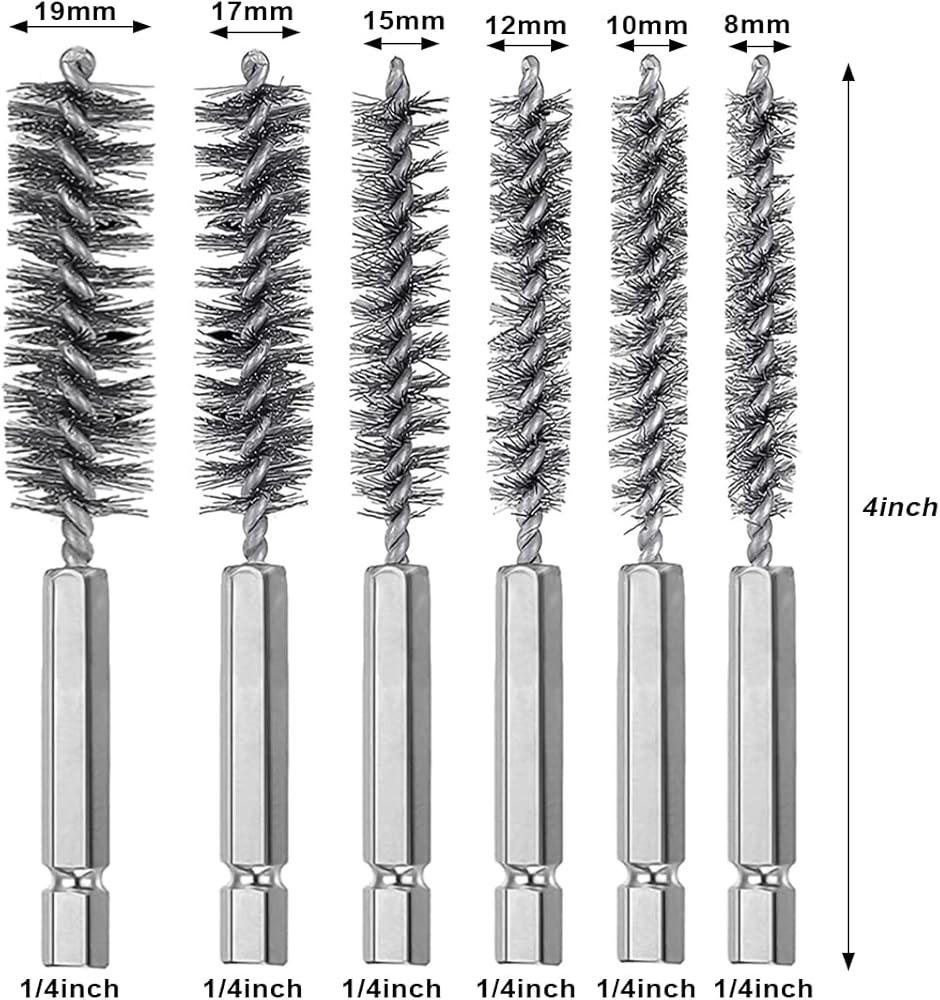 Different Sizes: 6 sizes of twisted wire stainless steel bore brushes, including 8 mm, 10 mm, 12 mm, 15 mm, 17 mm and 19 mm in diameter. Each brush has 4 inch in length and 1/4 inch hex shank to be mounted on any power drill or die grinder (not included).