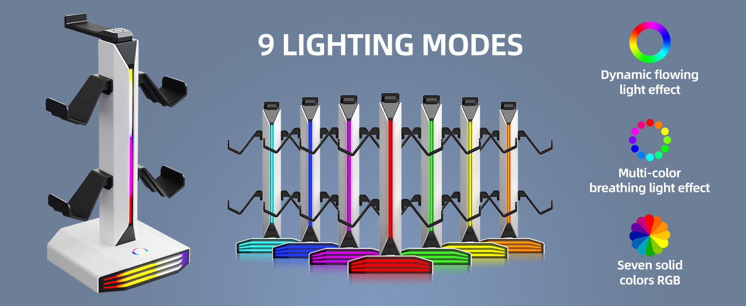 تسعة أوضاع إضاءة: بنقرة واحدة فقط، يقوم حامل وحدة التحكم بالتبديل بين أوضاع تأثير الإضاءة. يحتوي على 7 ألوان وميض سريع، وضوء تنفس بـ 7 ألوان ووضع ضوء أحادي اللون: الأحمر والأخضر والأزرق والأرجواني والأزرق الفاتح والأصفر والأبيض، مما يخلق جوًا رائعًا لغرفة الألعاب الخاصة بك. اضغط لفترة طويلة لمدة ثانيتين لإطفاء الضوء.