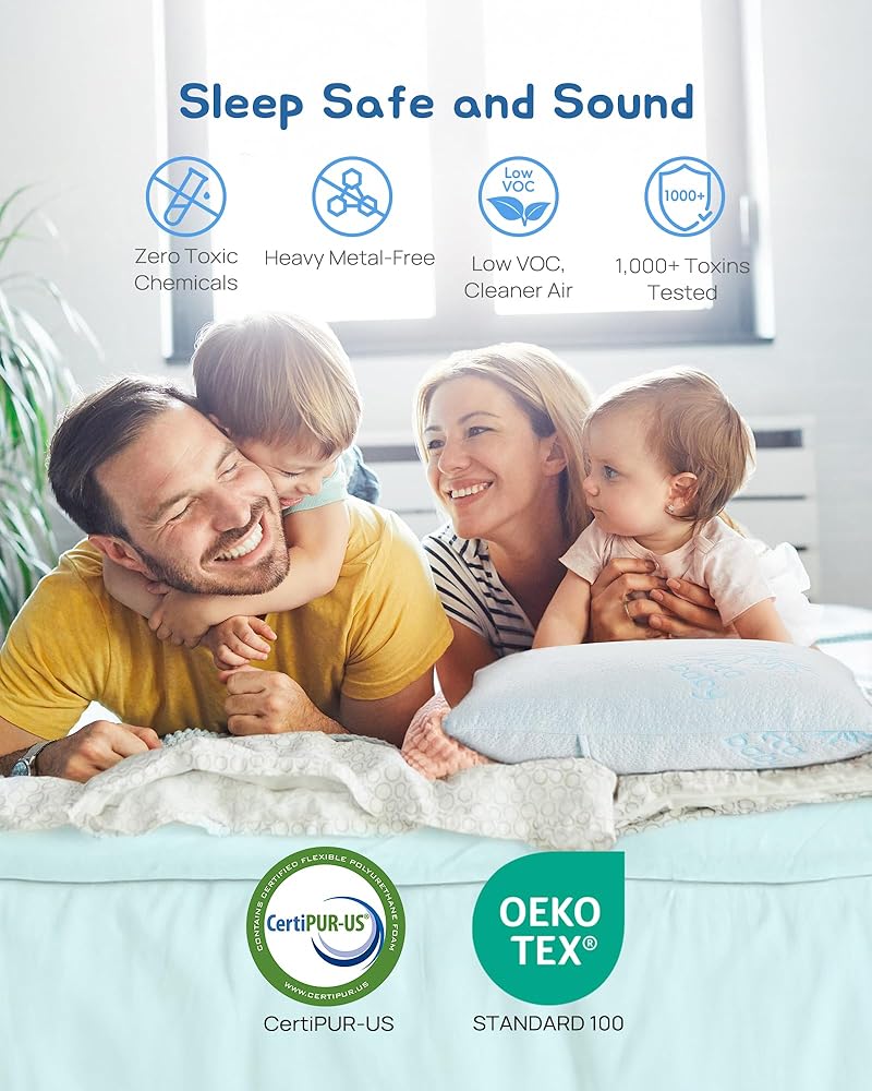 تم اختباره واعتماده من الداخل إلى الخارج: حشوات الوسادة مصنوعة من إسفنج الذاكرة المعتمد من CertiPUR-US، وغطاء الوسادة مصنوع من قماش معتمد بمعايير OEKO-TEX 100. تم اختبار الوسادة بأكملها مقابل قائمة تضم أكثر من 1000 مادة ضارة لضمان نوم أطفالك بأمان.