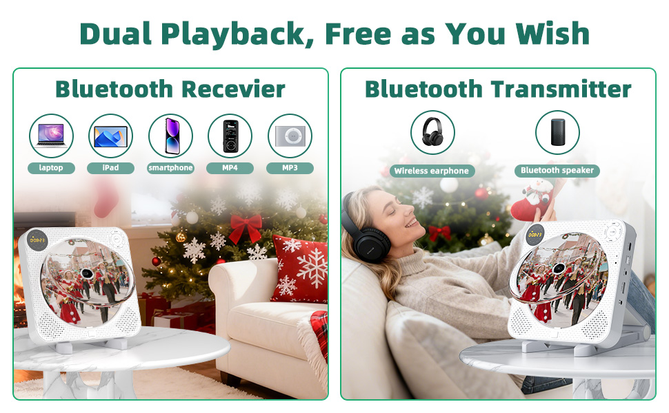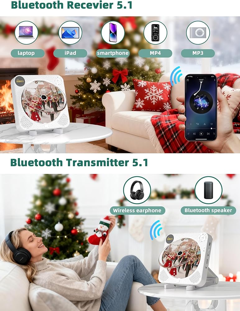 【مشغلات أقراص مضغوطة بلوتوث للمنزل】 لا يستطيع مشغل الأقراص المضغوطة المنزلي لدينا تشغيل الأقراص المضغوطة لإصدار جامعي فحسب، بل إنه مجهز أيضًا بإصدار بلوتوث 5.1، الذي يحتوي على وظائف استقبال ونقل بلوتوث. يمكنه الاتصال بسماعات الرأس اللاسلكية أو مكبرات صوت Bluetooth لتشغيل الموسيقى، ويمكنه أيضًا استقبال الإشارات من أجهزة Bluetooth مثل الهواتف المحمولة والأجهزة اللوحية وأجهزة الكمبيوتر المحمولة لتشغيل الموسيقى بسهولة.