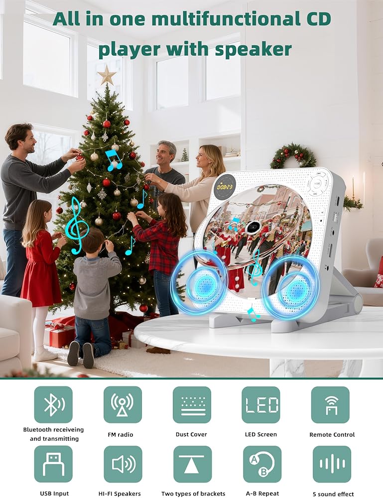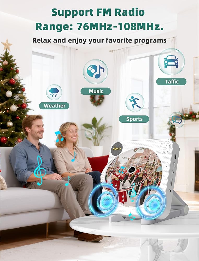 【مشغل أقراص مضغوطة متعدد الوظائف مع مكبرات صوت 】يحتوي مشغل الأقراص المضغوطة المزود بالراديو على راديو FM مدمج، ويدعم 76 ميجا هرتز - 108 ميجا هرتز. وهو متوافق مع صيغ CD، CDR، HDCD، MP3، WMA. هناك 5 أنواع من أوضاع التشغيل و5 معادل صوت، مما يجعلها مثالية للاستماع إلى الأقراص المضغوطة الثمينة. يحتوي مشغل الأقراص المضغوطة هذا على منفذ USB ويدعم محركات أقراص USB المحمولة (تنسيق FAT32، بحد أقصى 32 جيجابايت).
