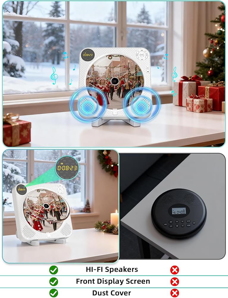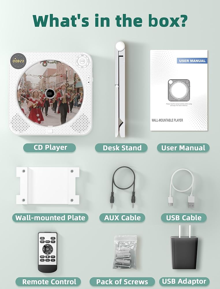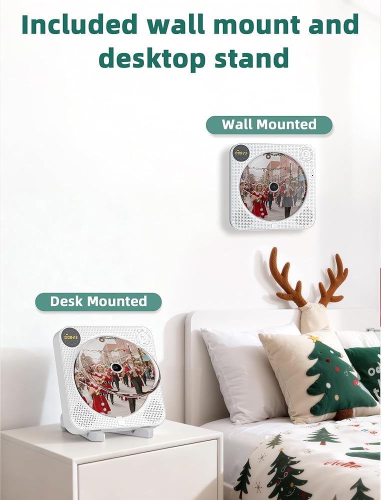 【مشغل أقراص مضغوطة للحائط والمكتب】يأتي مشغل الأقراص المضغوطة الصغير المثبت على الحائط مع حامل مكتب ولوحة مثبتة على الحائط. يمكنك تثبيته في غرفة المعيشة وغرفة النوم والمطبخ والحمام وغيرها من الأماكن. الموسيقى الجميلة ستزيل كل تعب عائلتك. بالإضافة إلى التثبيت على الحائط، يمكنك أيضًا استخدام حامل سطح المكتب لوضعه على الطاولة لتشغيل الكتب الصوتية.
