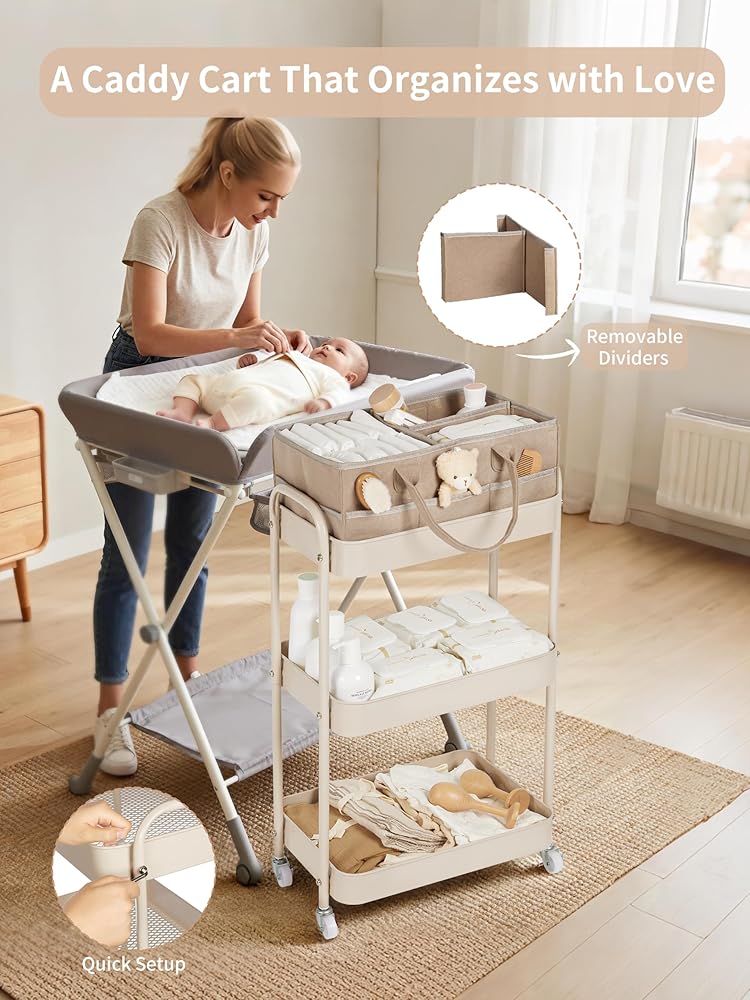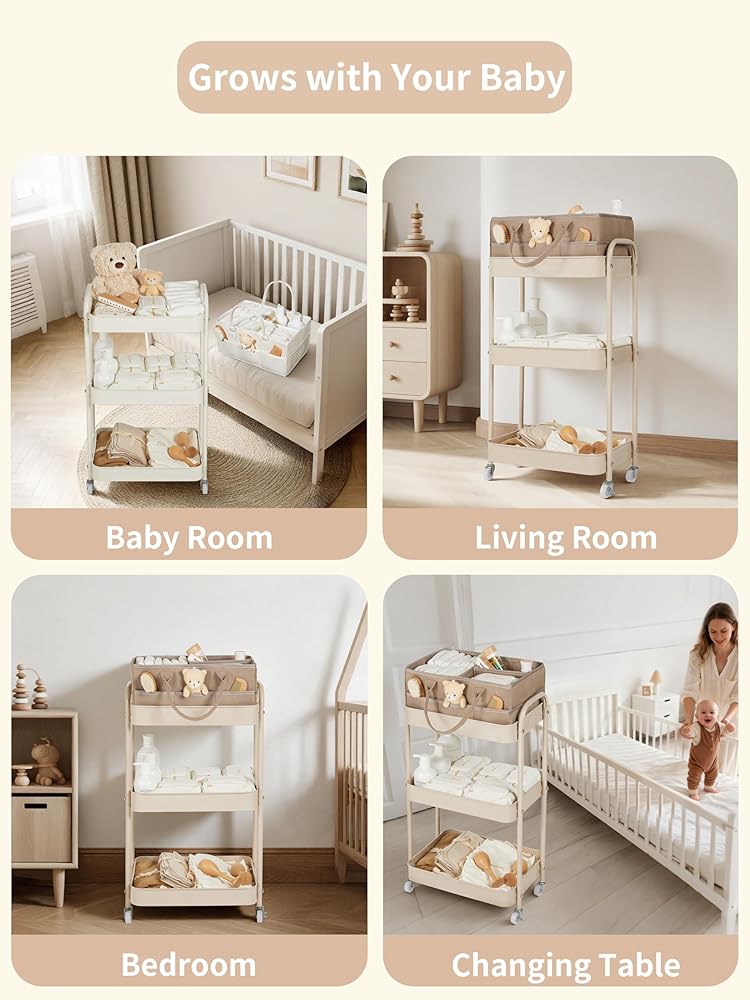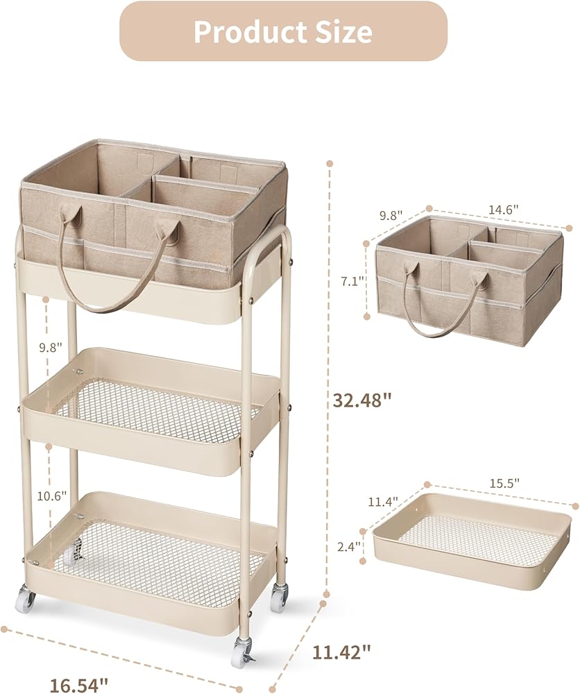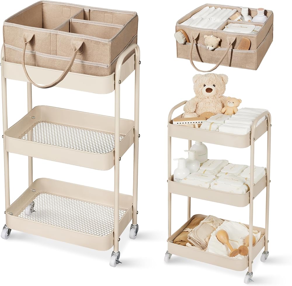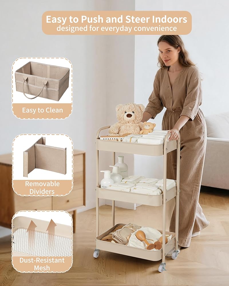 【تخزين ثلاثي الطبقات】هذه العربة الدوارة الأنيقة المكونة من 3 طبقات باللون البيج مثالية لتنظيم مستلزمات الطفل مثل الحفاضات والمناديل المبللة والزجاجات. مثالية كعربة تنظيم لعلبة الحفاضات أو منظم لتخزين زجاجات الأطفال على سطح الطاولة، مع فواصل قابلة للفصل من أجل مساحة قابلة للتخصيص. مجهزة بـ 4 عجلات، مناسبة لغرف النوم وغرف الأطفال والحمامات وغيرها من الإعدادات.