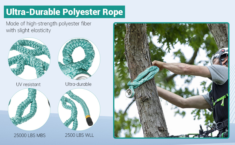 حبل متين للغاية: مصنوع من ألياف البوليستر عالية القوة مع مرونة بسيطة، والحبل مقاوم للأشعة فوق البنفسجية، ومضاد للشيخوخة، ومتين. الحد الأقصى لقوة الكسر هو 25000 رطل/2500 رطل حمل العمل