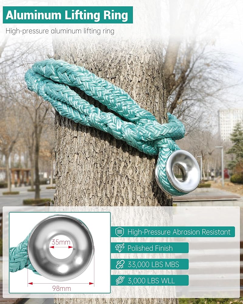 حلقة تثبيت من الألومنيوم الفاخر: حلقة التثبيت مصنوعة من قطعة واحدة من الألومنيوم المصبوب عالي الضغط (القطر الداخلي 35 مم)، مع صلابة عالية ومقاومة للتآكل. السطح المصقول يقلل بشكل فعال من التآكل أثناء الرفع. الحد الأقصى لقوة الكسر هو 33000 رطل/3000 رطل حمل العمل