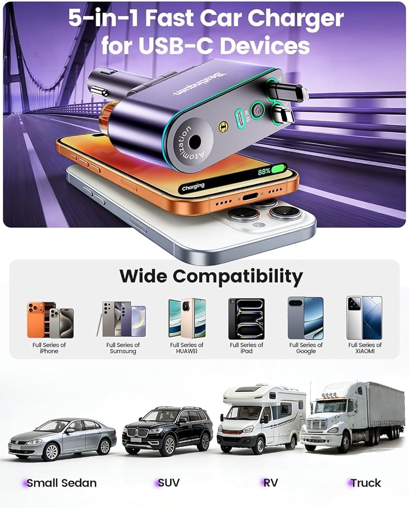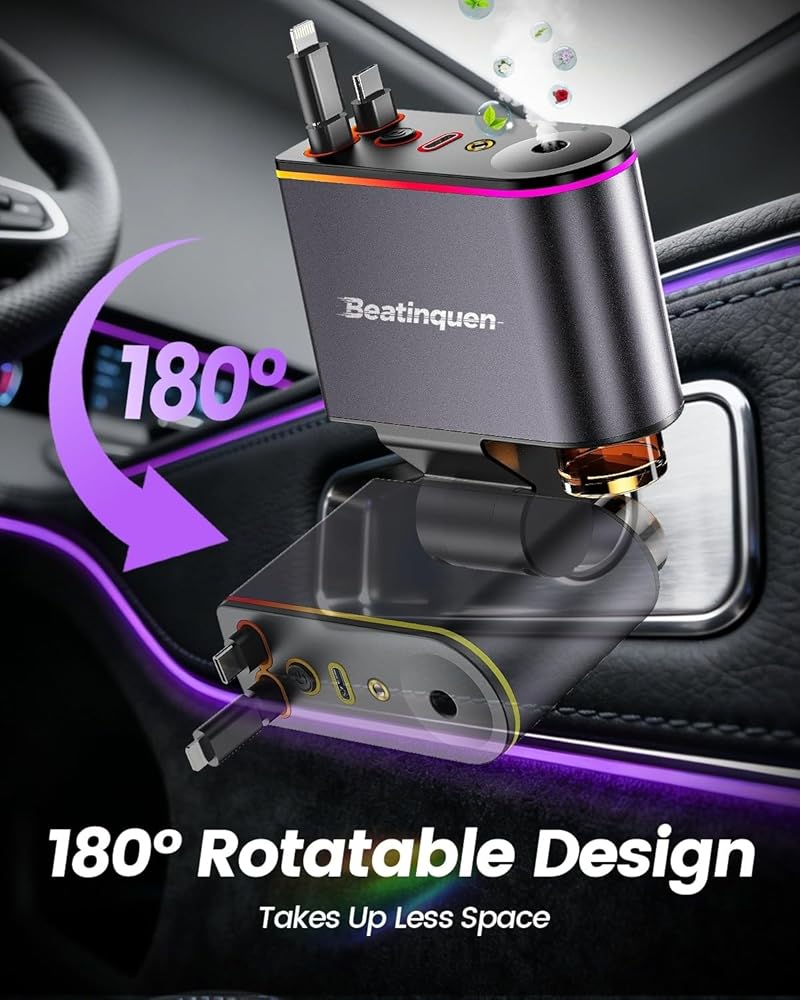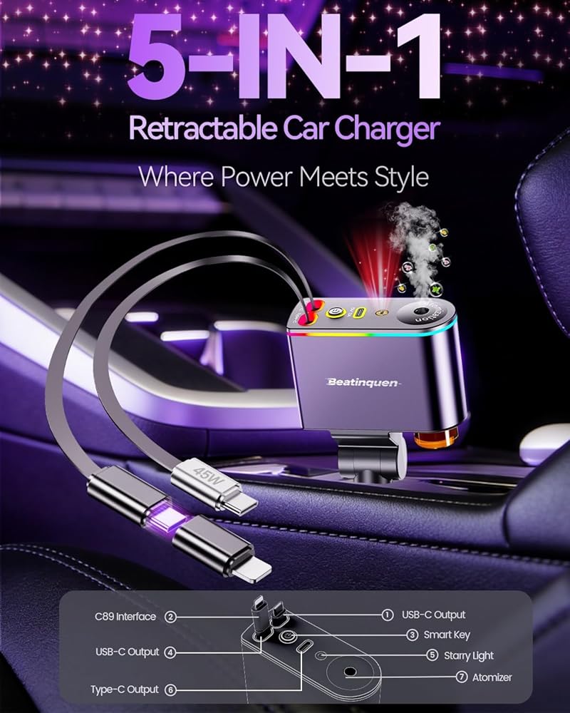شاحن سيارة للهاتف متعدد المنافذ 5 في 1: يأتي شاحن السيارة القابل للسحب هذا مزودًا بكابلين USB-C قابلين للسحب، وموزع معطر الهواء، وأضواء النجوم. يناسب مقابس ولاعة السجائر القياسية 12 فولت USB C وهو مثالي للرحلات الطويلة أو القيادة اليومية. إنه حل عملي لشحن أجهزة متعددة في المساحات الضيقة مثل السيارات الصغيرة أو كابينة الشاحنات.