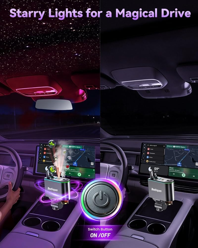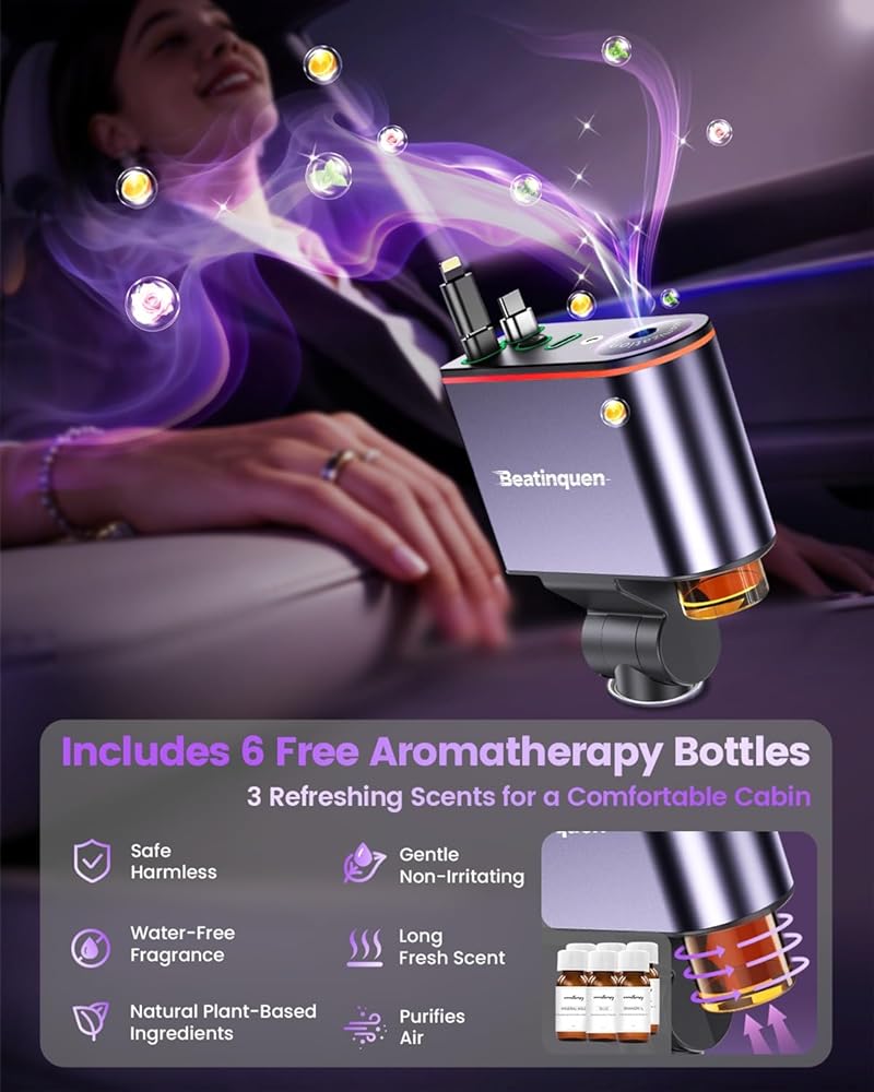 العلاج العطري الرومانسي وإضاءة المزاج RGB: شاحن السيارة القابل للسحب مجهز بـ 6 زجاجات من الزيوت العطرية العلاجية النباتية الطبيعية ذات الروائح المختلفة. من خلال موزع الروائح العلاجي المتكامل، يمكنك ملء سيارتك برائحة منعشة دافئة وممتعة دون الحاجة إلى الماء أو الحرارة. تضيف إضاءة RGB الديناميكية وإضاءة السماء المرصعة بالنجوم متعة قيادة سحرية إلى نزهات ليلة الهالوين، مما يجعلها رفيقًا موثوقًا به لمغامرات عيد الميلاد أو الهالوين.