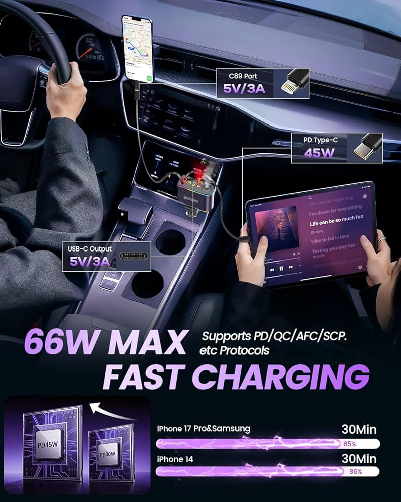أداء شحن سريع بقدرة 66 وات: يشتمل شاحن هاتف السيارة القابل للسحب هذا على كبلات USB-C مزدوجة قابلة للسحب ومنفذ إضافي من النوع C. يمتد سلك الطاقة القابل للسحب حتى 30 بوصة، مما يحافظ على نظافة سيارتك وتنظيمها. مثالي للشحن السريع عبر USB-C لأجهزة iPhone 17 Pro وSamsung Galaxy S25 والأجهزة الأخرى المتوافقة مع USB-C. إنه ملحق سيارة عملي مثالي لمستخدمي الأجهزة المتعددة وهدية فريدة لعشاق السيارات.
