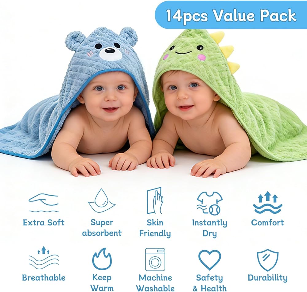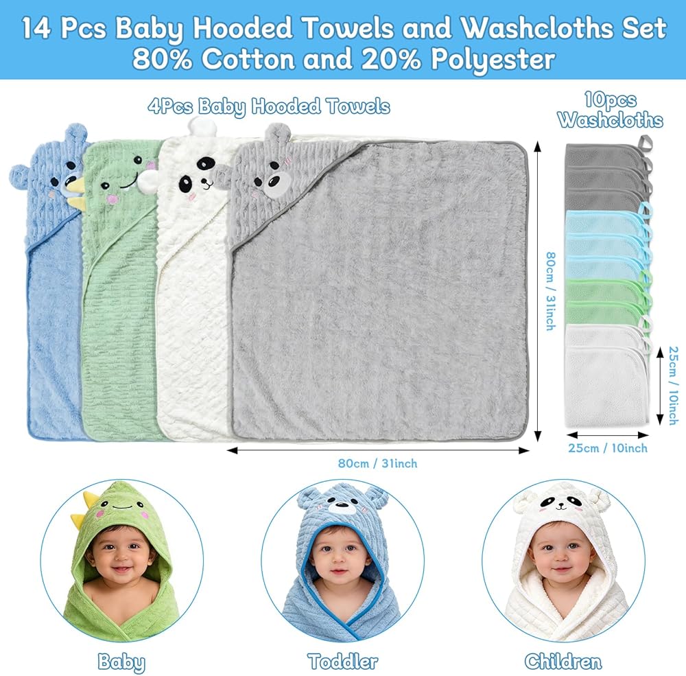[What You Will Get] You will receive 14 pcs of hooded baby towels and washcloths set. Including 10 pcs baby washcloths (25 x 25 cm) and 4 pcs large baby towel hood (80 x 80 cm). Made from ultra-soft, absorbent fabric, provide a gentle touch for your baby's delicate skin, making bath time cozy. Perfect for home or on the go, this hooded baby towels set is an essential addition to your baby care