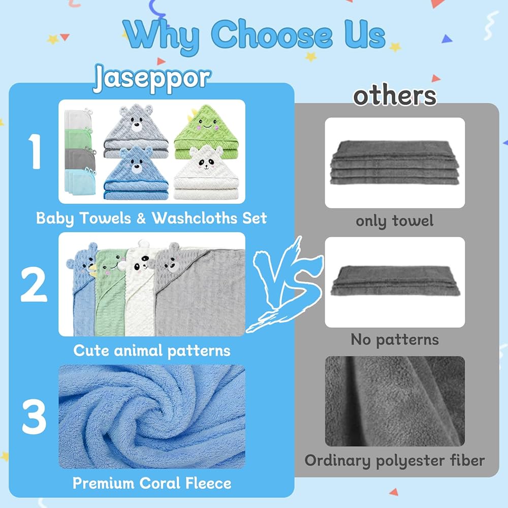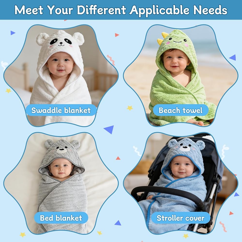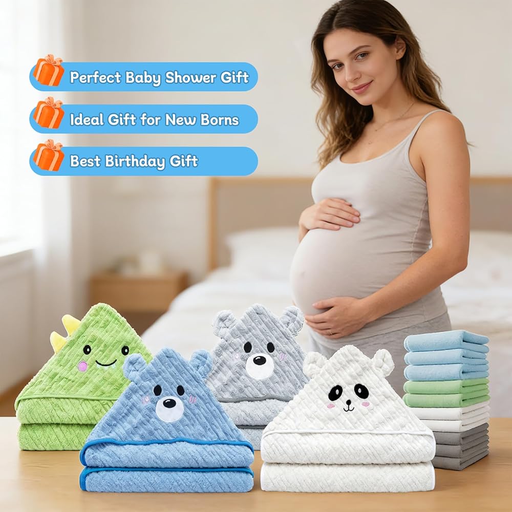 [Cute Design-Baby's Bath Time Buddy] Our newborn baby towels include three adorable baby towels with hood featuring playful characters: 1pcs Blue + 1pcs Green + 1pcs Gray + 1pcs White. These playful characters make bath time fun and cozy, while the hood keeps your little one warm and dry. Your little angel is sure to love these charming baby towels and washcloths set