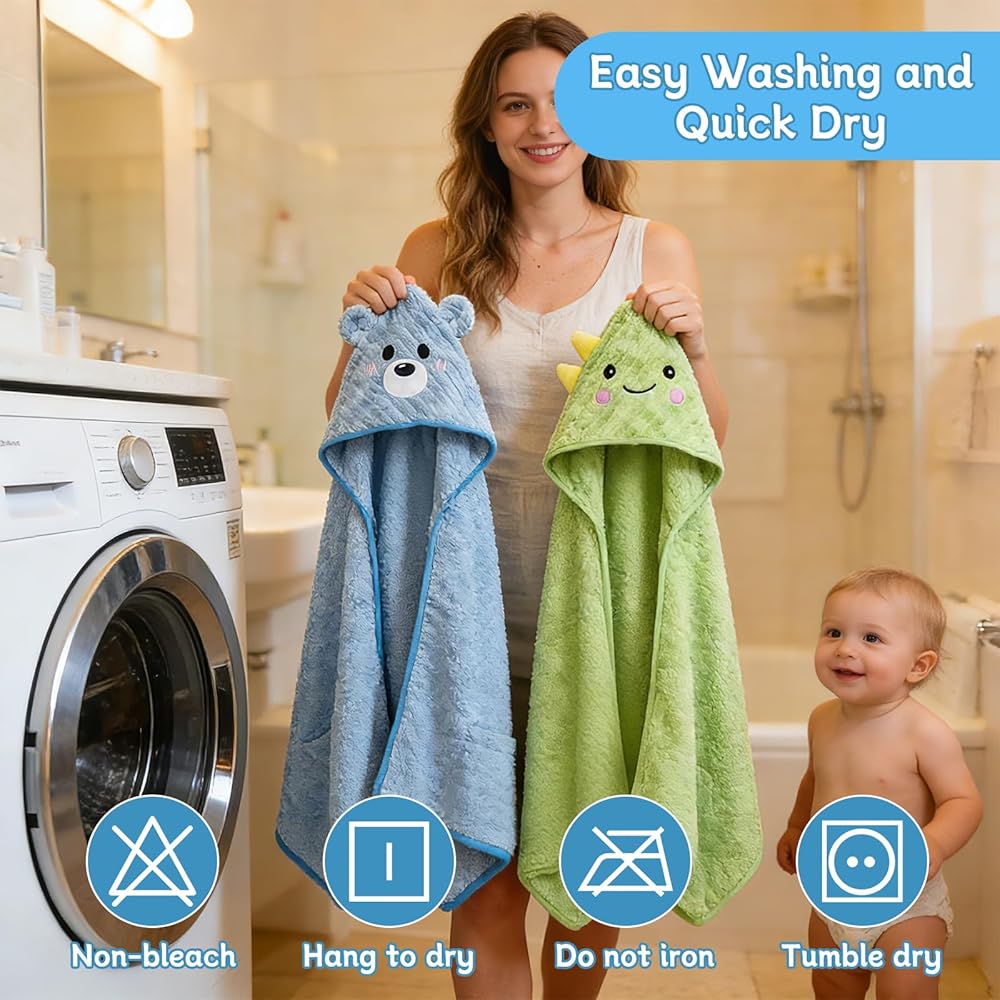 [Soft and Absorbent] Our baby towels with hoods and washcloths are perfect for babies. These baby hooded towels and washcloths are ultra-soft and highly absorbent, quickly drying your baby's hair and body in seconds. They'll keep your little one dry, warm, and comfortable after every bath. Plus, the durable material stays soft even after countless washes – perfect for everyday use