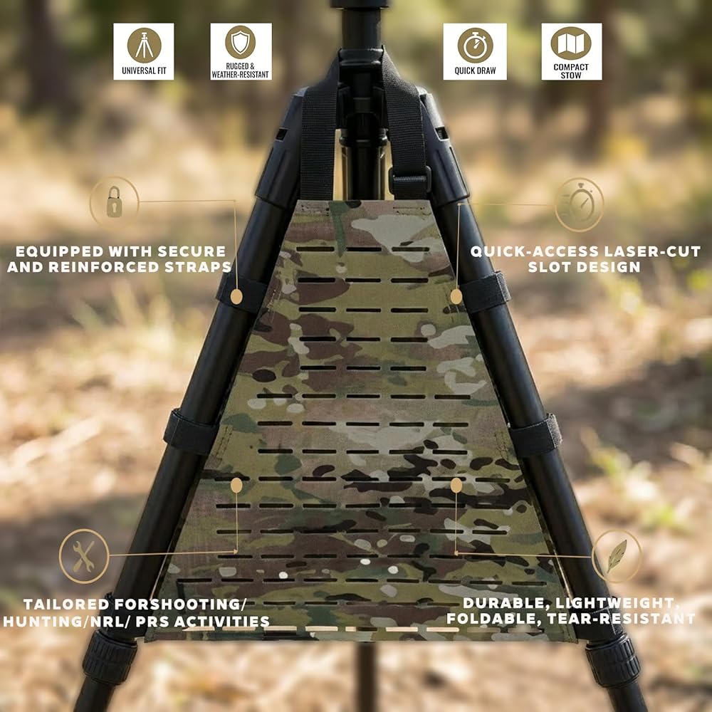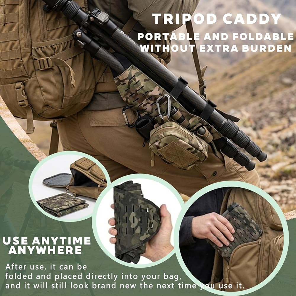 Durable, Lightweight & Low-Profile Construction:Made from rugged, abrasion-resistant Multicam tear-resistant material, this tripod caddy is both tough and lightweight. Its low-profile design blends into outdoor environments, offering discretion during hunting or shooting while adding minimal bulk to your setup,without extra burden,After use, it can be folded and placed directly into your bag, and it will still look brand new the next time you use it.