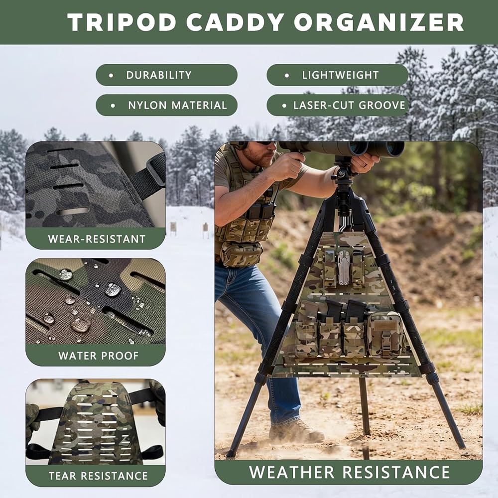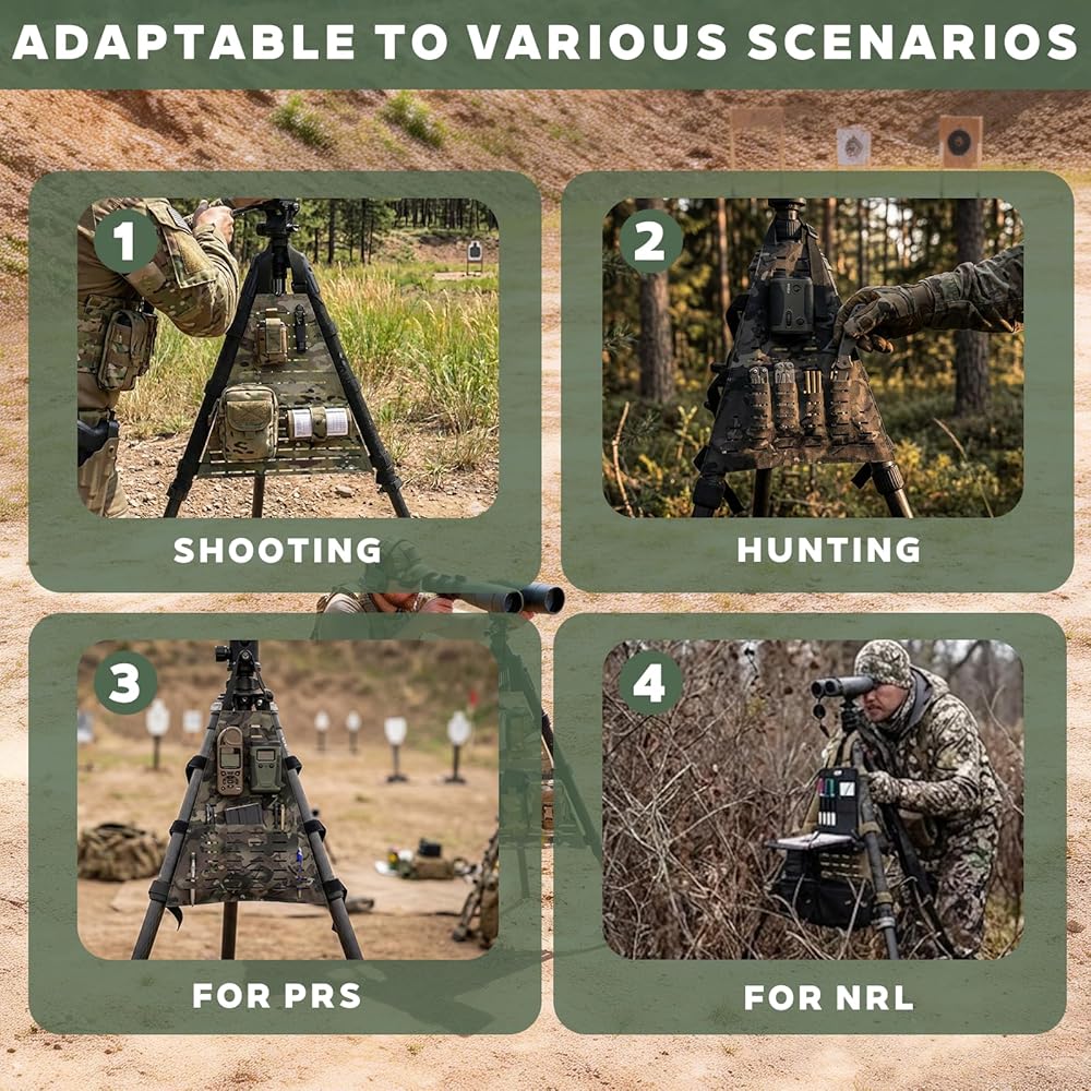 Tailored for Shooting & Hunting Scenarios:This tripod organizer is specifically designed to fit tripod setups used in for shooting, hunting, NRL, and PRS activities.Ideal for match photography, especially designed for range officers. As the perfect hunting organizer, it keeps your essential gear securely organized and instantly accessible during fast-paced sessions.