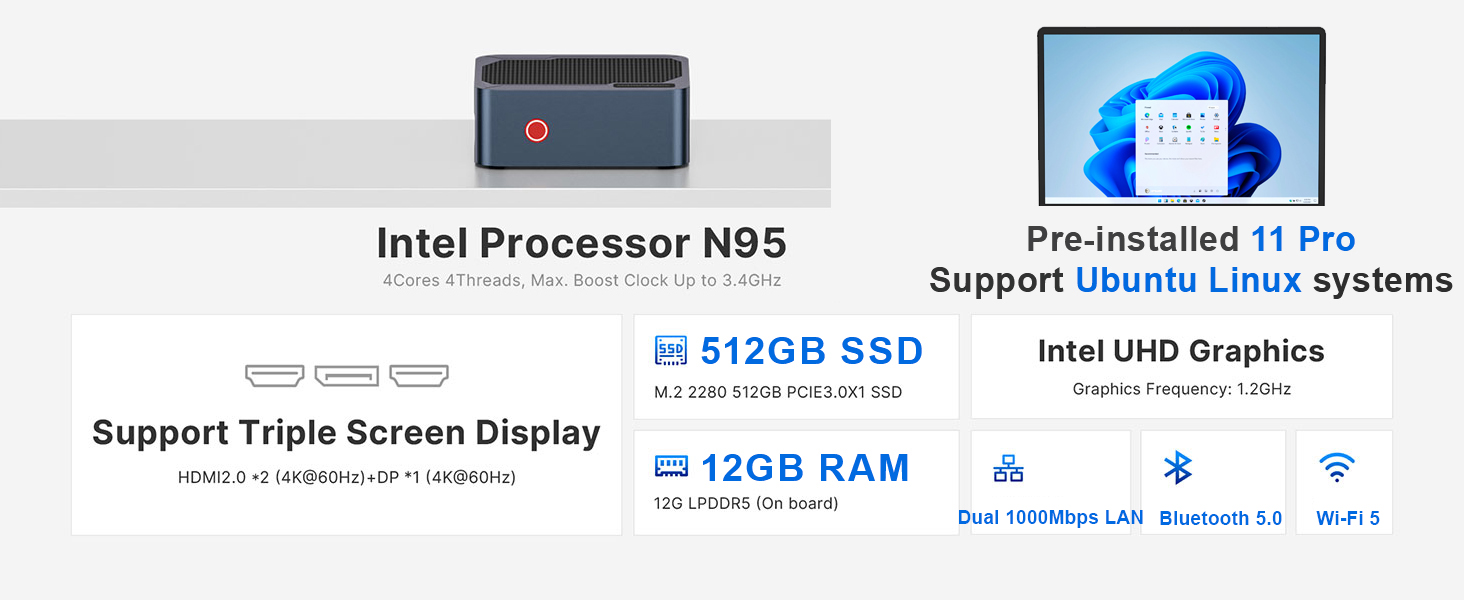 【دعم العرض الثلاثي 4K】يتميز هذا الكمبيوتر الصغير المدعوم بـ N95 برسومات Intel UHD (التردد الديناميكي الأقصى 1.2 جيجا هرتز) لمعالجة الصور بشكل أسرع وتشغيل الفيديو بدقة 4K. بفضل منفذي HDMI 2.0 ومنفذ DP واحد، فإنه يدعم الشاشات الثلاثية - مما يعمل على توسيع مساحة العمل الخاصة بك وتقديم تجربة بصرية غامرة بدقة 4K، مما يعزز الإنتاجية.