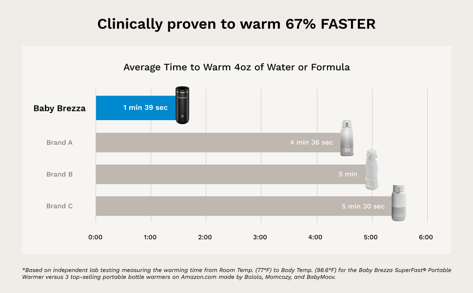 The Baby Brezza SuperFast Portable Bottle Warmer is the fastest, most advanced way to warm breastmilk, formula, water or a filled milk storage bag on the go. Now available in bold Black color. It's clinically proven to warm up to 3x faster than other portable warmers, including 8 oz in 3 minutes (from room temp to 98°F). Its Advanced Sensor Technology safely and evenly warms milk and formula from top to bottom, protecting nutrients. No more adapters, leaks or turning bottles upside down! This rechargeable travel warmer warms up to eight 6 oz bottles (from room temp to 98°F) on a full charge, and it easily fits in cupholders or bottle pockets in diaper bags and backpacks, cars and strollers. The interior stainless-steel cup holds 9 oz of liquid or a filled 6 oz milk storage bag, and the dishwasher safe lid features a 360° pour spout. Choose from 4 warming temperatures: 80°F, 98°F, 99°F, or 103°F. Includes USB-C charging cable. Full charging time is 3-5 hours depending on power adapter (not included). Use 20W charging block for fastest charging. Charges in 3 hours with 18W charging block & 5 hours with 10W charging block. 1 year limited warranty (not valid if shipped outside the US).