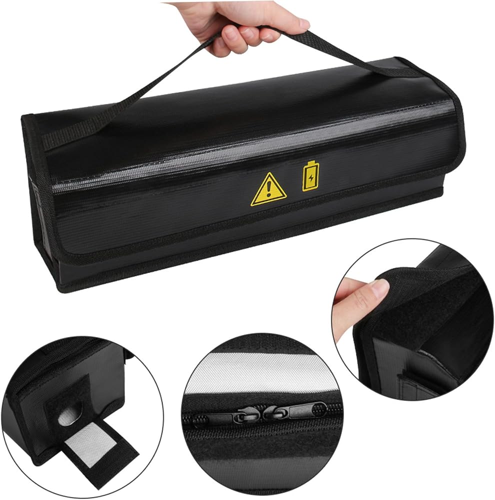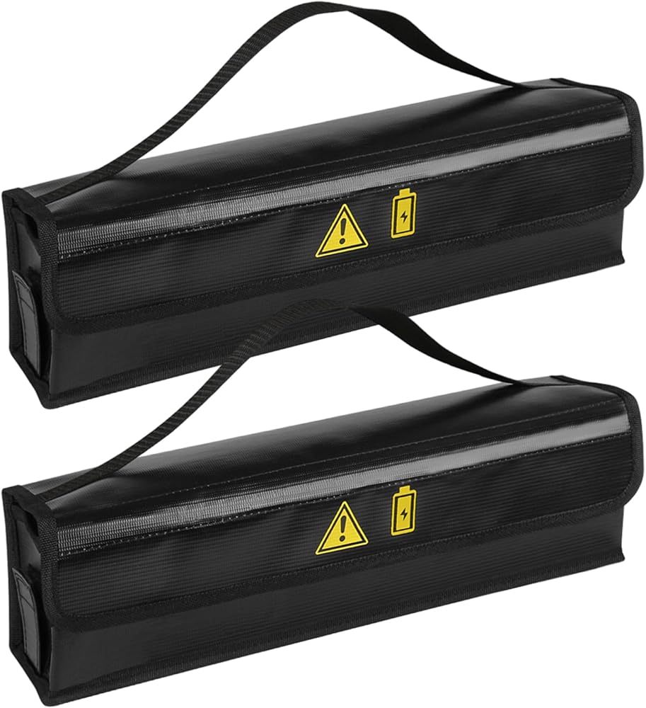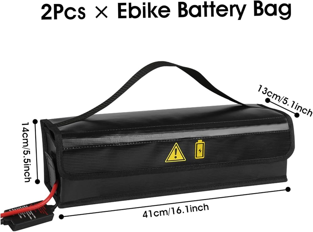 The 2PCS Ebike Battery Bag is designed for safe charging and storage of lipo batteries. Measuring 16x5.5x5 inch, each bag provides large-capacity space that fits a variety of ebike battery models. Constructed from advanced fireproof and waterproof materials, it can against fire, heat, and moisture, giving your batteries secure storage at home or on the go. This explosion-proof bag features a convenient carry handle, making it easy to transport between indoor and outdoor locations. Whether you're using it in your garage, workshop, or during a bike trip, the bag ensures batteries remain safe and organized. The zipper closure is designed with a cable hole, allowing you to charge batteries without removing them from the protective enclosure. Practical and effective, this set of two bags provides peace of mind by reducing the risks associated with battery charging and storage. It is a reliable safety solution for ebike enthusiasts and anyone who frequently handles lipo batteries.