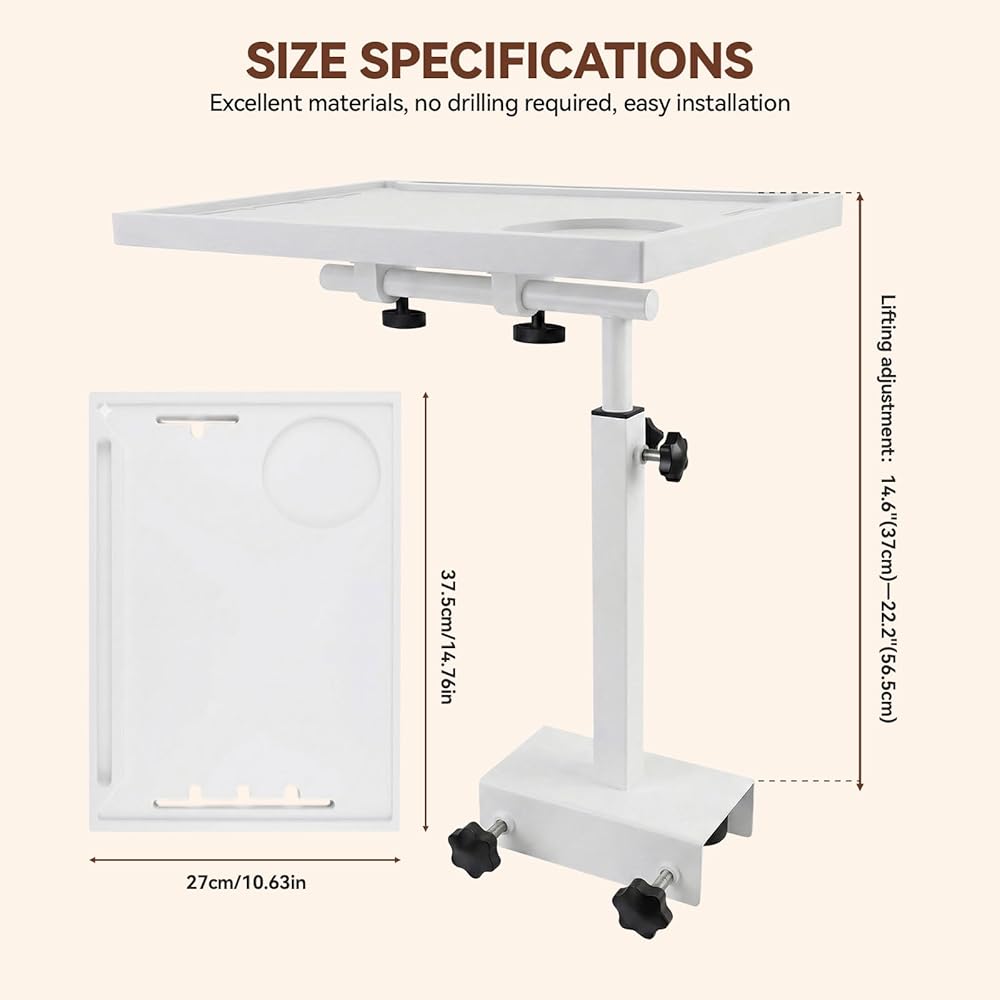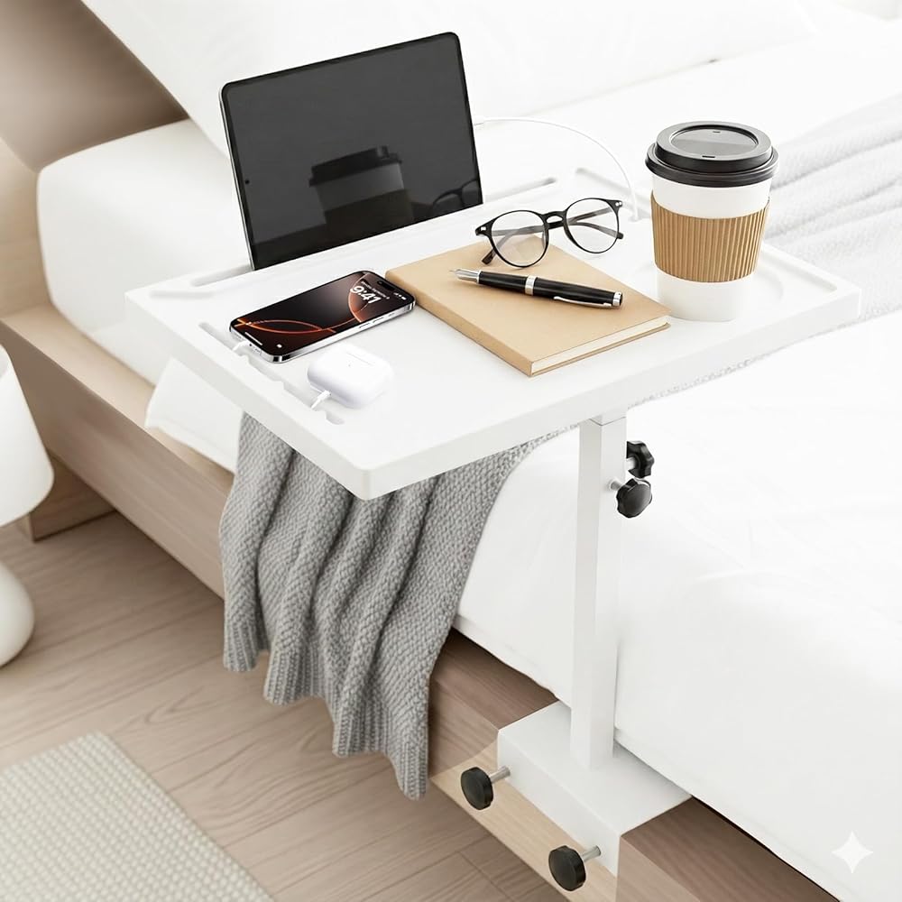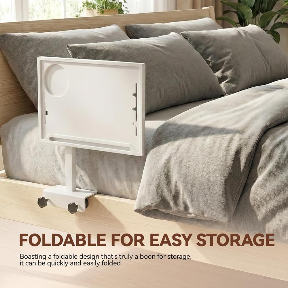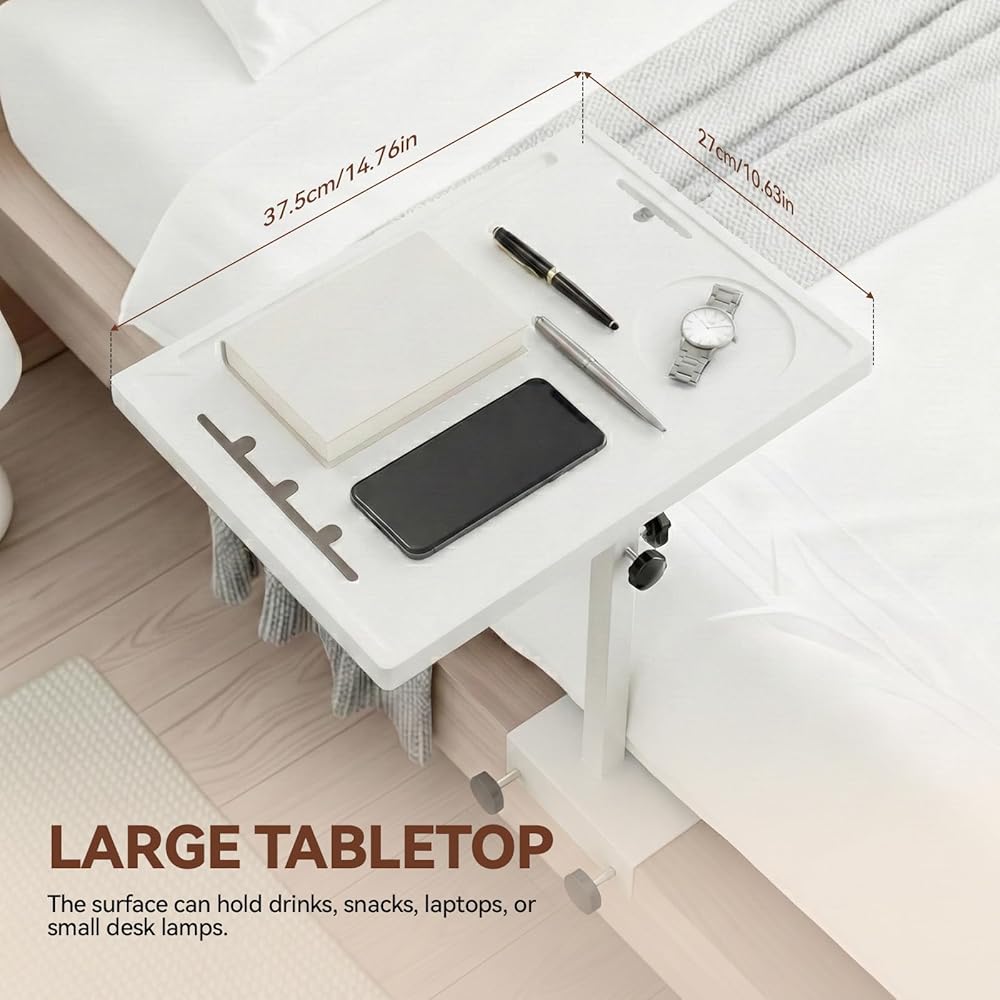 رف بجانب السرير متعدد الوظائف مقاس 15 بوصة: مقاس 15 بوصة × 10.6 بوصة، يناسب بشكل مريح جهاز كمبيوتر محمول مقاس 15 بوصة مع جهاز iPad والهاتف والمشروبات والوجبات الخفيفة والأنسجة والكتب والنظارات وساعة المنبه وغيرها من الضروريات بجانب السرير. مزود بفتحة هاتف تتميز بفتحات لإدارة الكابلات للشحن بدون متاعب، كما يوفر الرف ارتفاعًا قابلاً للتعديل، وسطح طاولة قابل للدوران (مع اتجاهات التثبيت الاختيارية)، وتصميم قابل للطي لسهولة التخزين عند عدم الاستخدام - يمكن استخدامه كطاولة طعام مريحة داخل السرير أو حتى حامل عملي لجهاز العرض.