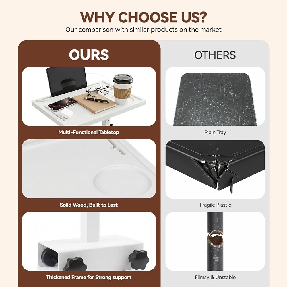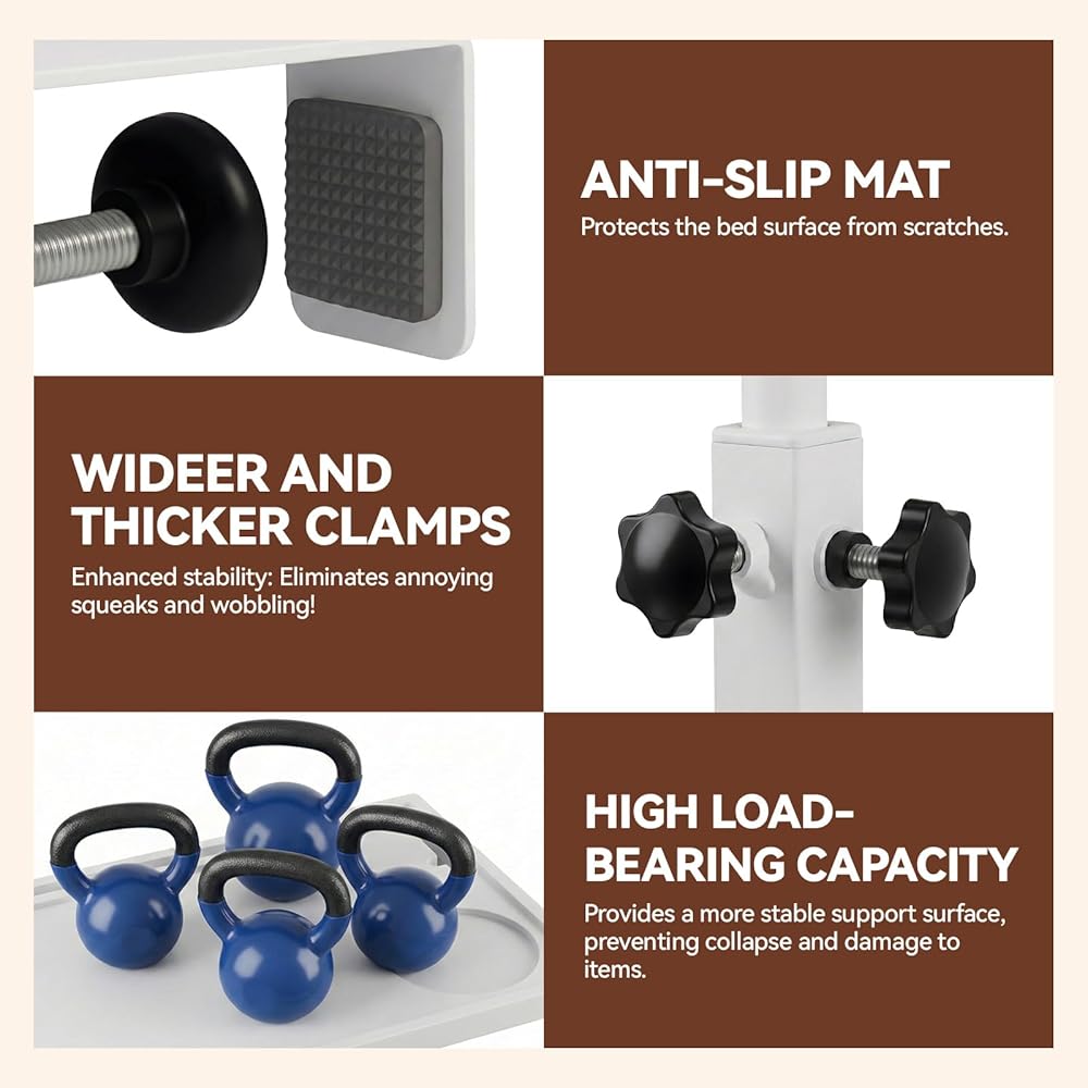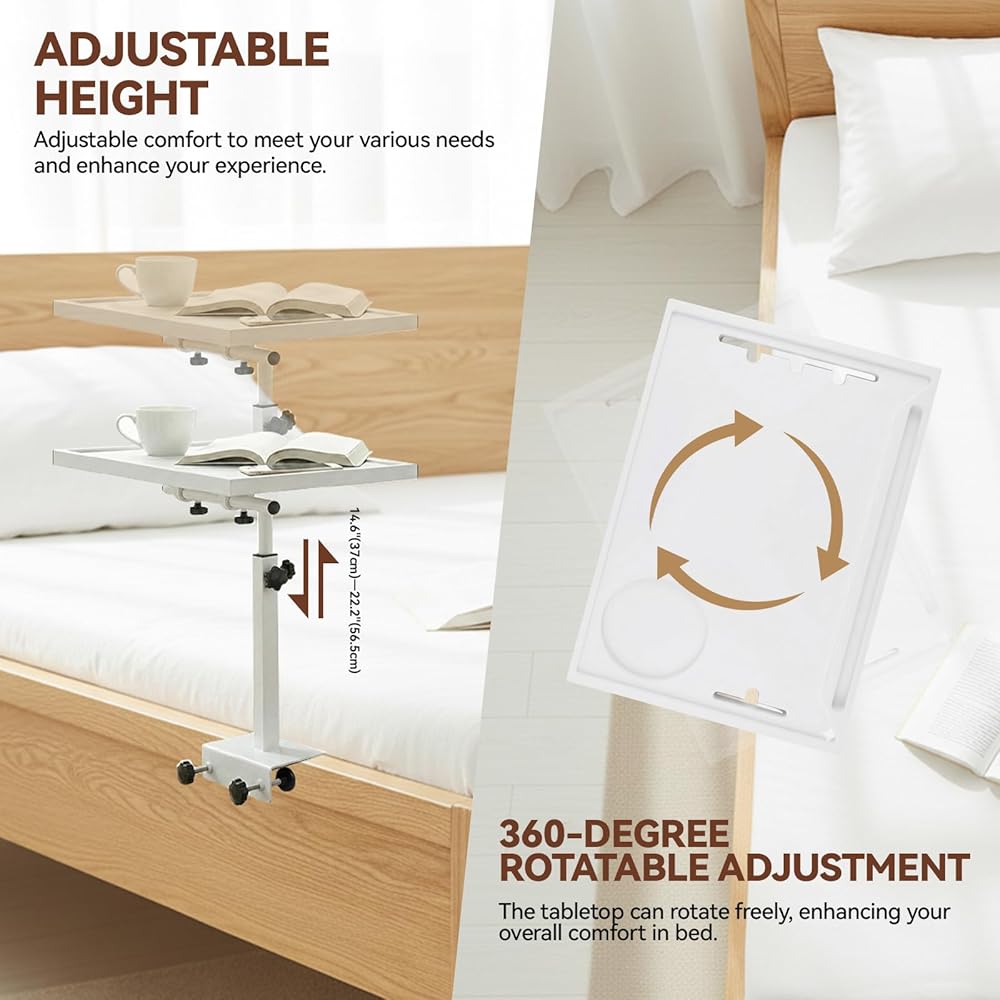 رف السرير الدوار القابل لضبط الارتفاع: على عكس حوامل السرير المرتفعة التقليدية، توفر صينية السرير لدينا إعدادات ارتفاع متعددة قابلة للتعديل. ما عليك سوى ضبط قضبان الدعم لتثبيت الارتفاع المفضل لديك، بينما يسمح سطح الطاولة القابل للدوران بحرية بوضع الزاوية بسهولة. تتيح لك إمكانية الضبط المزدوجة هذه تخصيص الارتفاع والزاوية بأقصى قدر من المرونة، مما يرفع مستوى الراحة في السرير إلى مستوى جديد تمامًا
