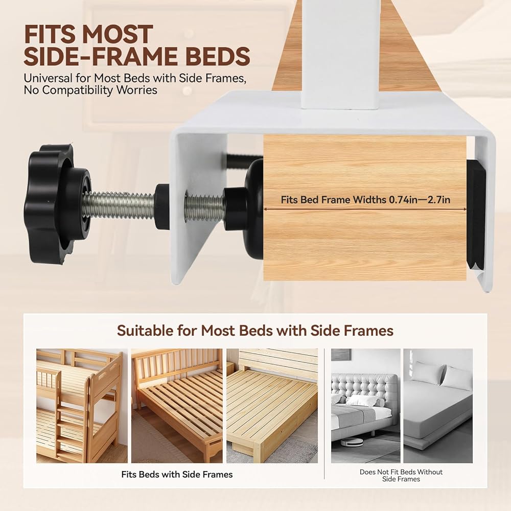 استخدام متعدد الاستخدامات وواسع النطاق: تتميز مشابك Bedshelfie الخاصة بنا بنطاق تثبيت قابل للتعديل من 0.7 إلى 2.7 بوصة، وتستوعب بسهولة الضروريات اليومية مثل المشروبات والوجبات الخفيفة وأجهزة الكمبيوتر المحمولة والهواتف والأكواب أو المصابيح الصغيرة. تم تصميمه ليناسب معظم أنواع الأسرّة - بما في ذلك الأسرّة المنزلية وأسرة السكن الجامعي وأسرّة الأطفال وحتى الكراسي بذراعين - وهي إضافة عملية لأي مساحة. تم تجهيز المشابك بوسادات لباد لمنع الخدوش على الأثاث الخاص بك، بينما يساعد الرف نفسه على زيادة المساحة المتاحة لديك عن طريق تنظيم الفوضى بشكل أنيق.