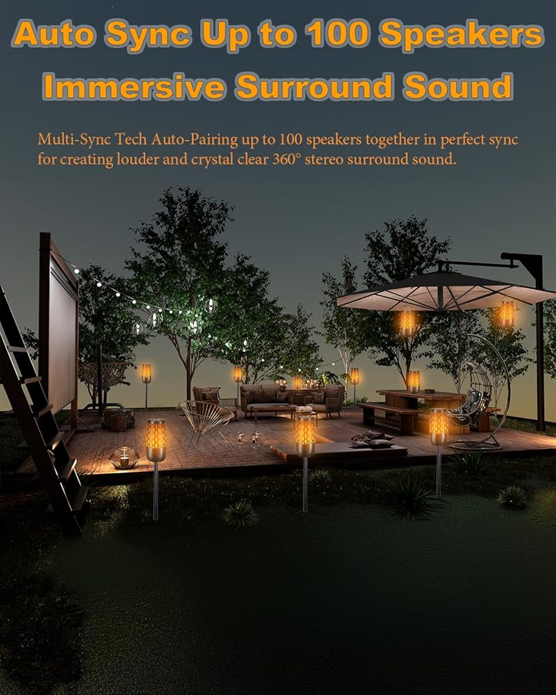مكبر صوت بلوتوث بتقنية المزامنة التلقائية المتعددة: حققت أحدث تقنيات المزامنة المتعددة الاقتران التلقائي لمكبرات الصوت المتعددة. يمكنك البدء في استخدامها بسرعة عن طريق تشغيلها في نفس الوقت. ما عليك سوى توصيل مكبر صوت Bluetooth من خلال هاتفك المحمول لتشغيل الموسيقى مع ما يصل إلى 100 مكبر صوت في نفس الوقت. مكبر الصوت المتصل بالهاتف المحمول هو مكبر الصوت الأصلي (يومض ضوء مؤشر الزر). يمكن توصيل مكبرات الصوت الفرعية الأخرى بشكل ثابت لتشغيل الموسيقى على بعد 50 قدمًا من مكبر الصوت الأصلي. يمكن التحكم في مستوى الصوت والأغاني التي يتم تشغيلها بواسطة مكبر الصوت الأصلي. عند استخدامه مرة أخرى، سيتم إكمال جميع الاتصالات تلقائيًا، مما يسهل استخدامه.