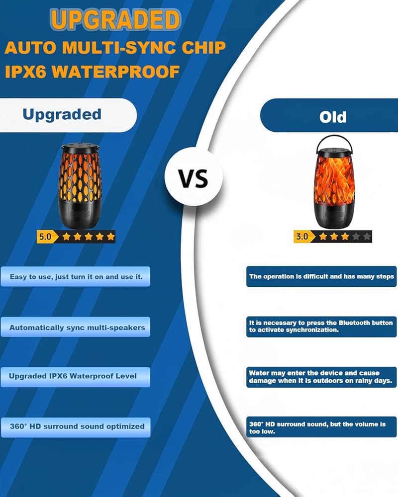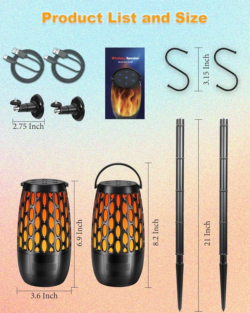 تُستخدم على نطاق واسع وأفكار هدايا للجميع: تقنية المزامنة التلقائية متعددة السماعات تحقق صوتًا محيطيًا عالي الدقة 360 درجة وعرض ضوء شعلة Tiki مما يجعل مكبر الصوت Flame Atmosphere هدايا إبداعية ورومانسية للأزواج، التغليف الرائع يجعلها خيارًا مثاليًا للهدايا لأصدقائك أو حبيبك أو والديك، وهدايا التخييم للرجال، وهدايا تدفئة المنزل، وهدايا عيد الميلاد للرجال والنساء، والفتيات المراهقات والأولاد. وهي أيضًا إضاءة ليلية لتزيين المنزل.
