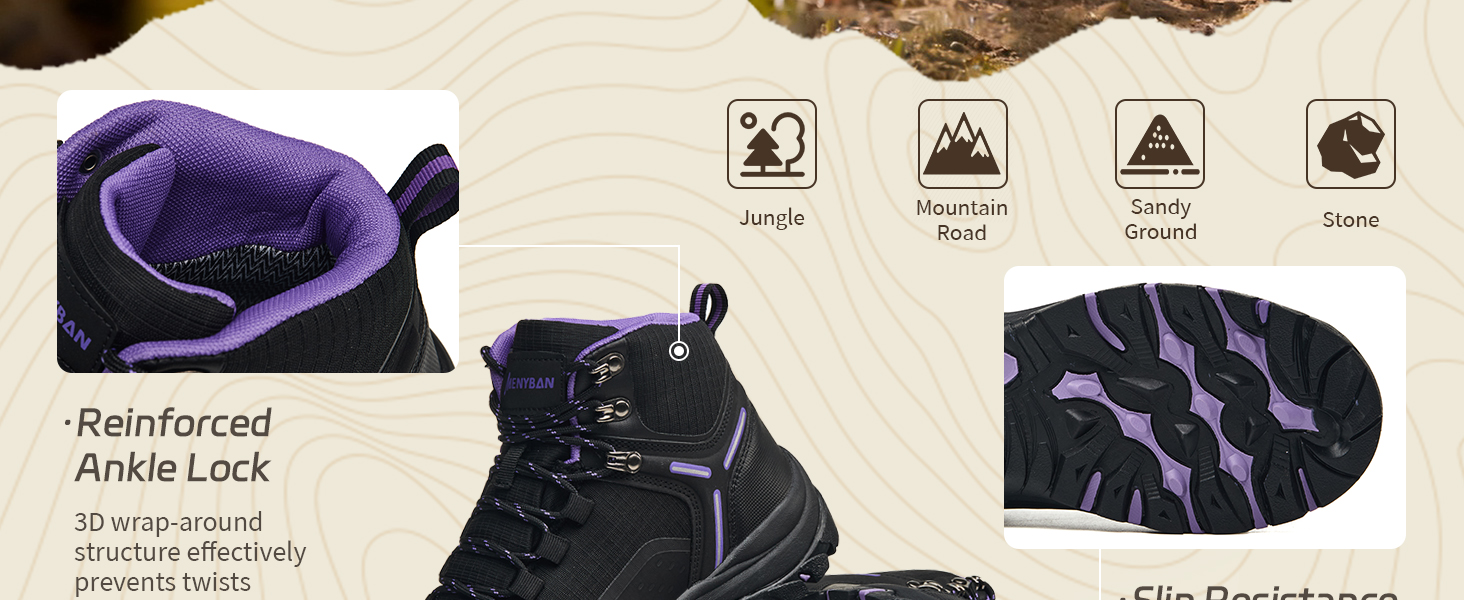 • احتكاك متين في الهواء الطلق: تم تصميم هذه الأحذية لتحقيق الثبات والثبات على التضاريس المتنوعة، وهي الخيار الأمثل لك للتنزه سيرًا على الأقدام أو التخييم أو ببساطة استكشاف الأماكن الخارجية الرائعة. جاهز للمغامرة، في كل خطوة على الطريق.