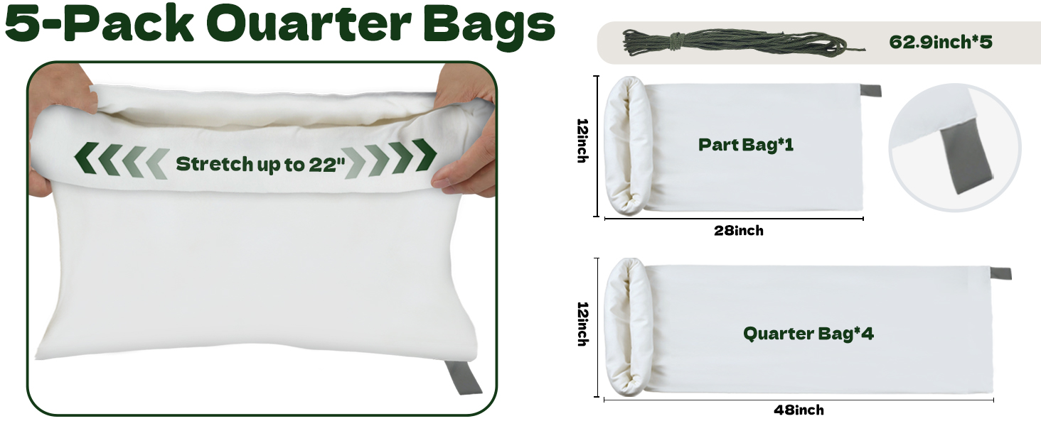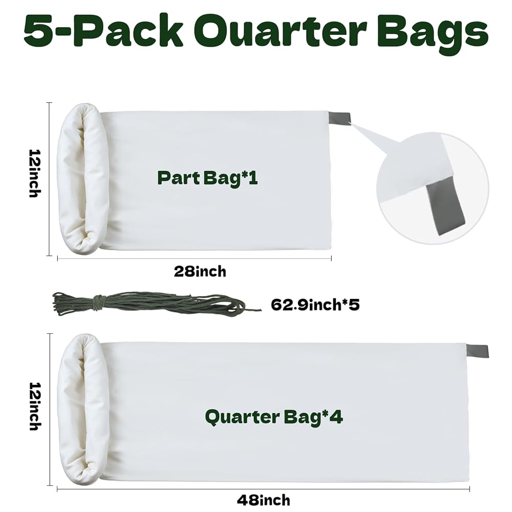 سعة كبيرة للغاية وسهولة الحمل: تم تصميمها لتلبية احتياجات الصيادين الحقيقية، وتمتد كل حقيبة ألعاب إلك حتى 22 بوصة - مما يوفر مساحة واسعة لتخزين ونقل الألعاب الكبيرة مثل ربع الأيائل أو الموظ لرحلات صيد الغزلان. تم تصميم المجموعة المكونة من 5 قطع بشكل مدروس: 4 أكياس كبيرة (12 بوصة × 48 بوصة) لتخزين الألعاب الكبيرة، بالإضافة إلى حقيبة صغيرة واحدة (12 بوصة × 28 بوصة) للقطع الصغيرة أو حقائب البط أو معدات الصيد أو ملحقات الصيد.
