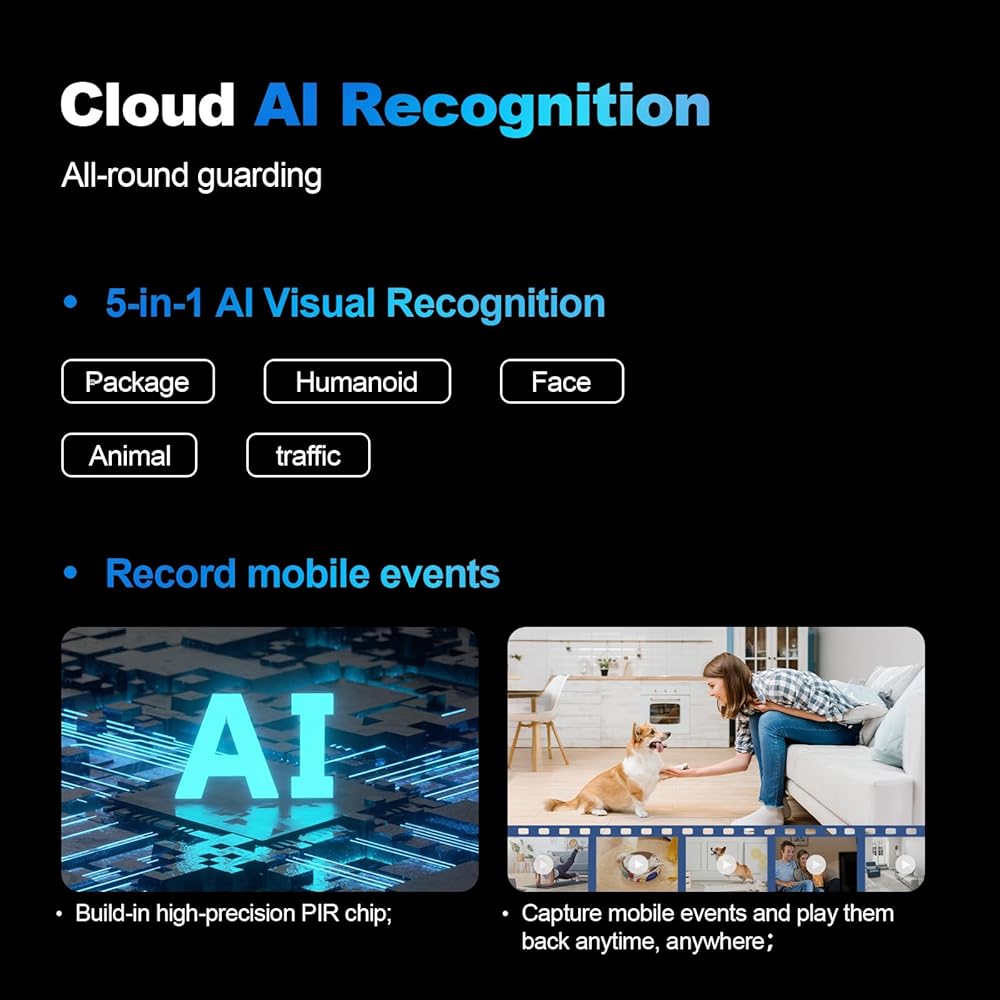 【الكشف والتصنيف الذكي بالذكاء الاصطناعي】تستخدم كاميرا الأمان بمقبس الضوء خوارزميات الذكاء الاصطناعي للتعرف على مقاطع الفيديو المسجلة وتصنيفها إلى أربعة أنواع: الأشخاص والمركبات والحيوانات الأليفة وأجهزة الإنذار، لسهولة البحث والتشغيل، وإرسال تنبيهات إلى أجهزتك المتصلة بمجرد اكتشاف الحركة، مما يسمح لك بمشاهدة اللقطات الحية في الوقت المناسب.