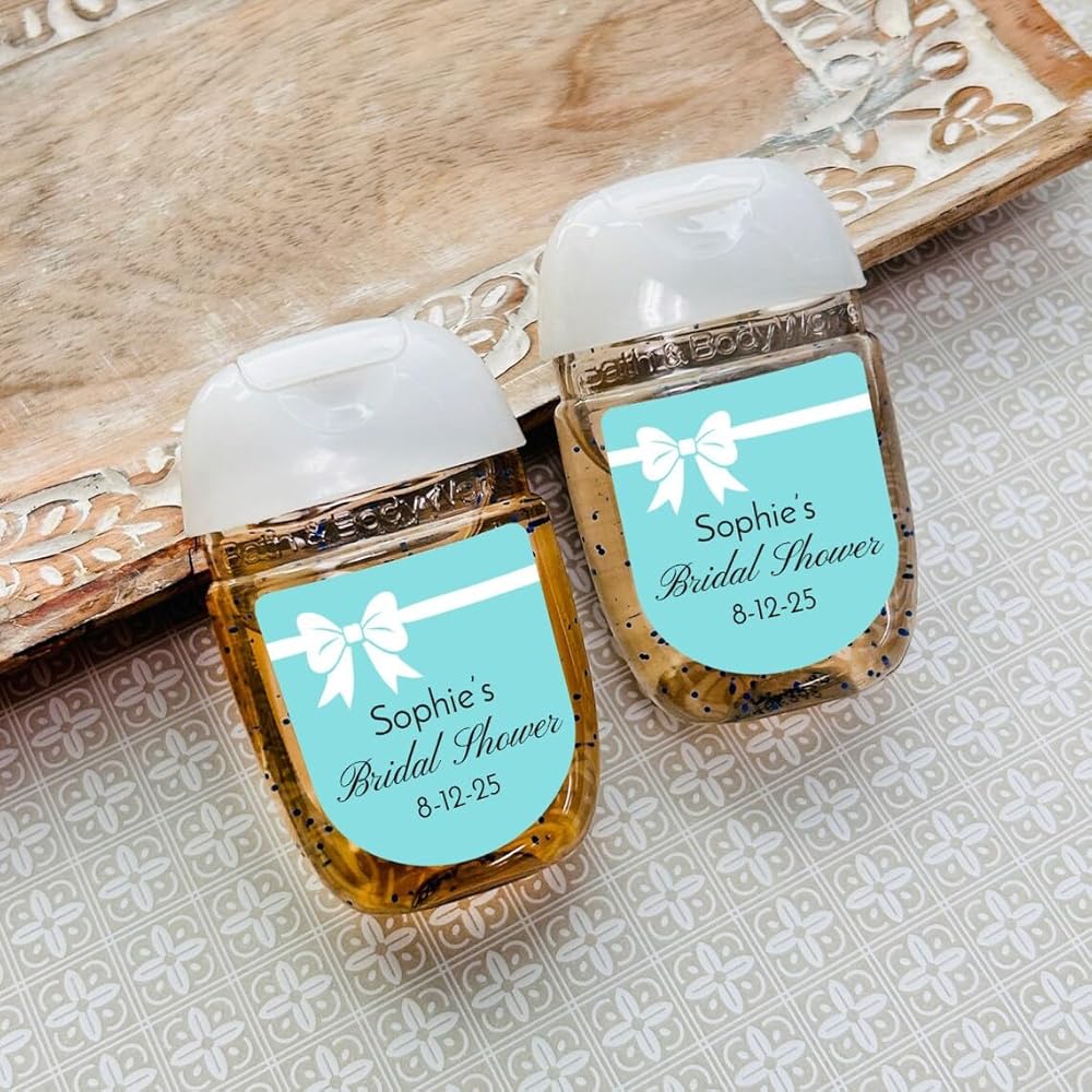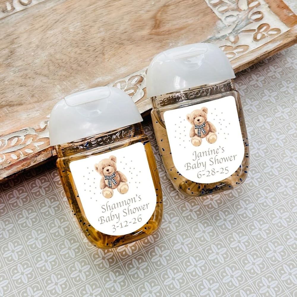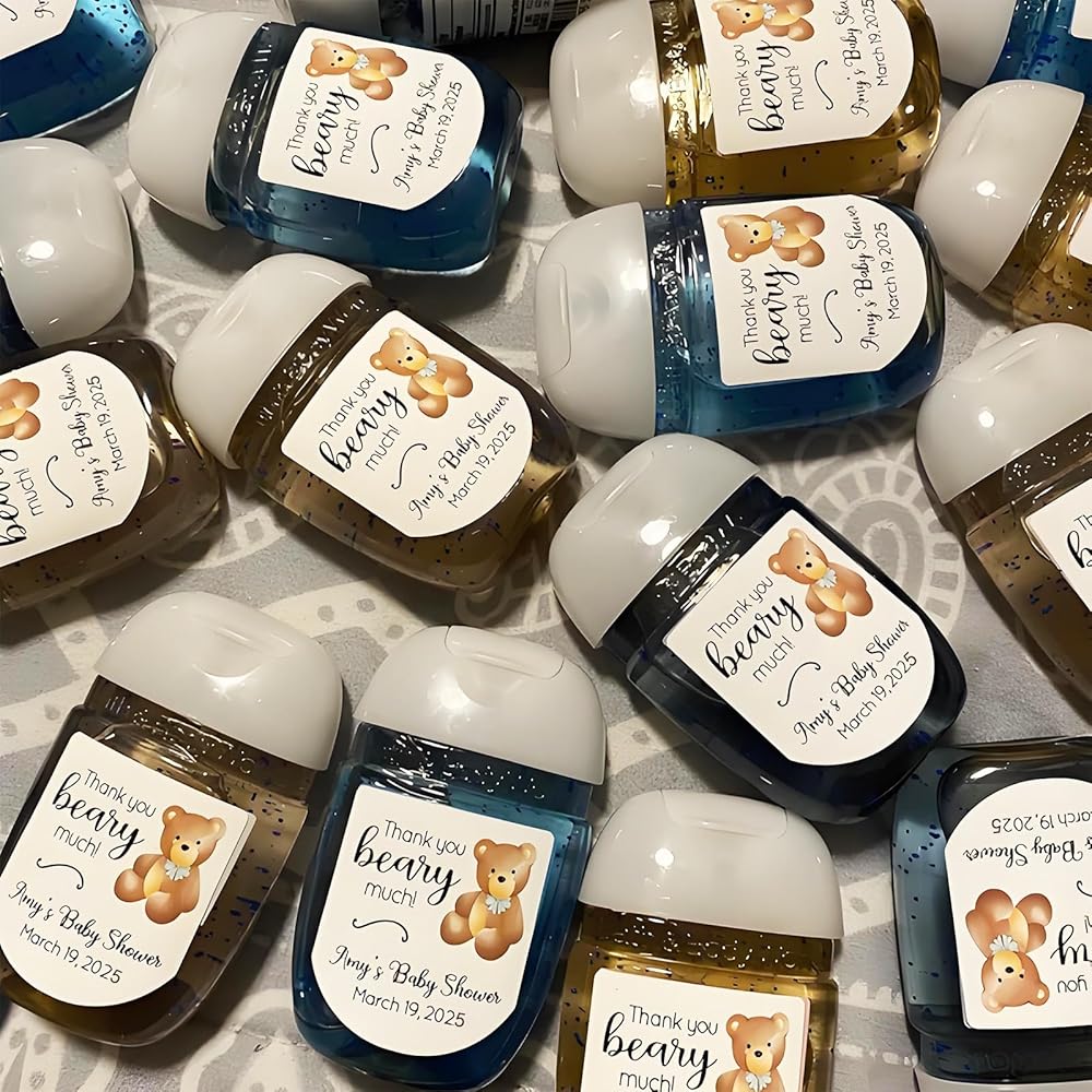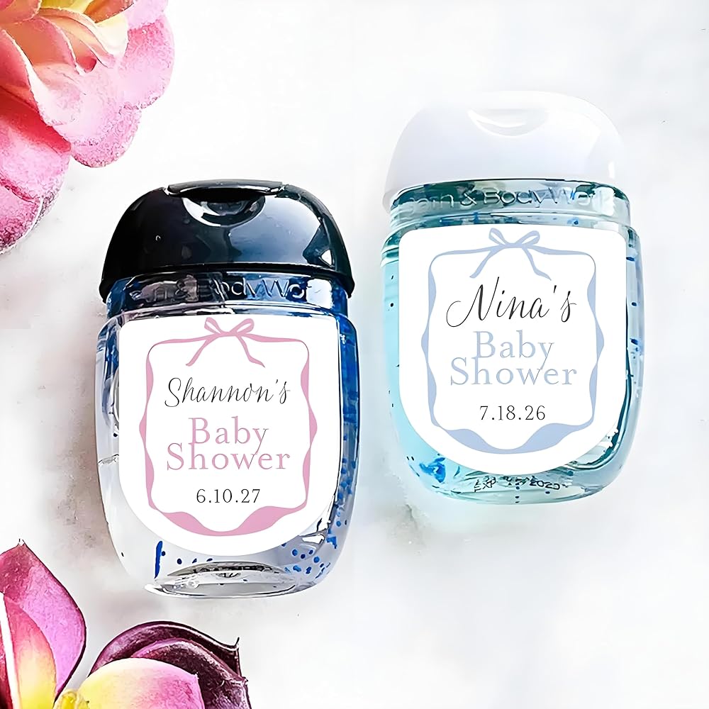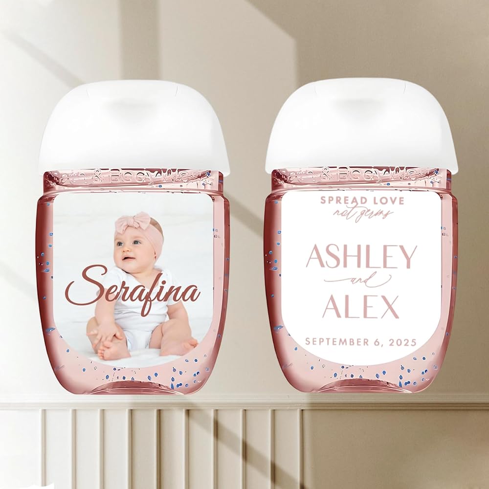 Add a personal touch to your baby shower favors with these elegant custom hand sanitizer labels. Perfect for decorating standard 1oz or 2oz hand sanitizer bottles, these high-quality stickers measure 1.38 inches in height and 1.28 inches in width for optimal coverage. Each pack includes 30/50/100 water-resistant labels that are easy to apply and designed to stay put. These labels transform ordinary hand sanitizers into thoughtful, personalized party favors that your guests will appreciate. The stickers can be customized with the baby's photo, parents' names, event date, and a heartfelt thank you message, making each favor uniquely special. These labels are an excellent way to add a coordinated, polished look to your baby shower celebrations while providing guests with a practical keepsake.
