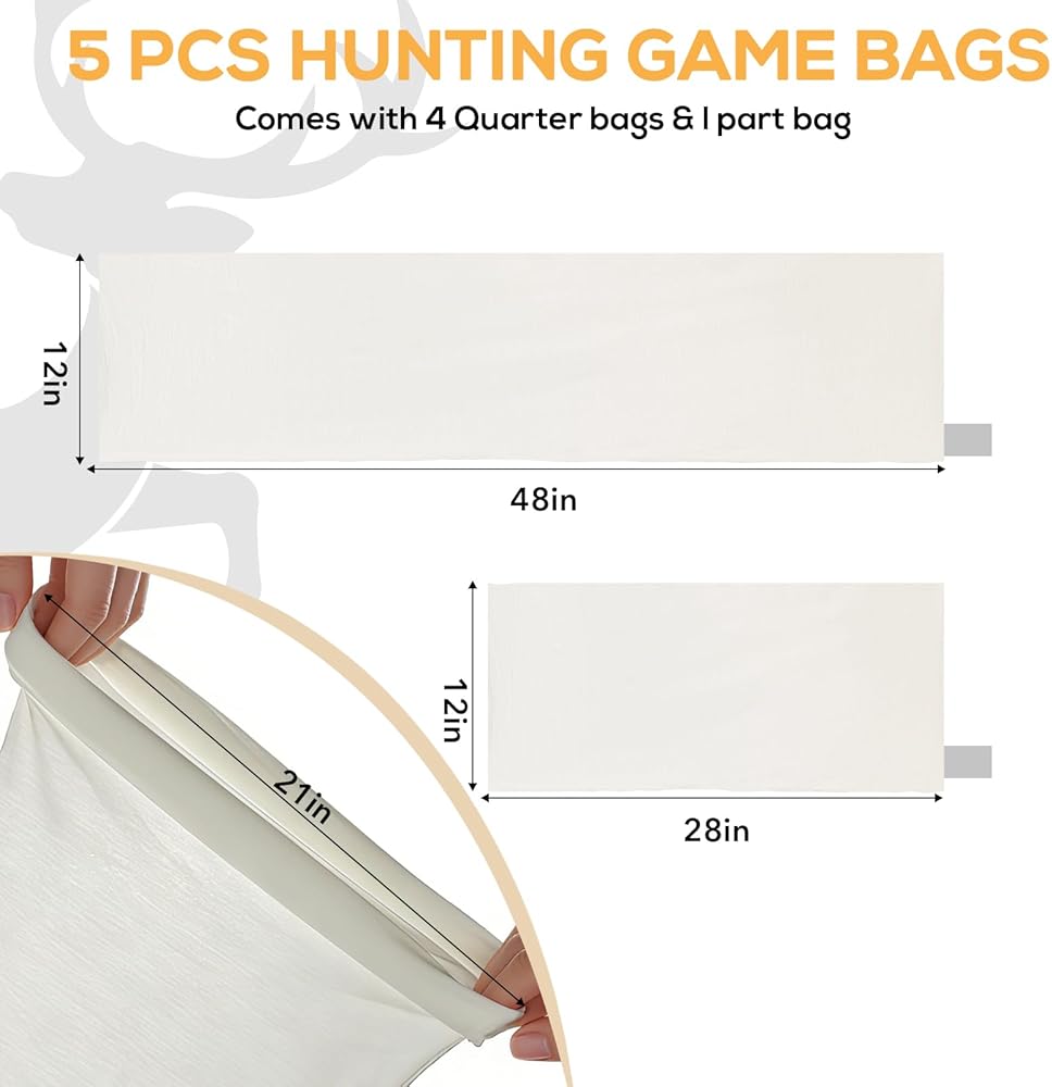 The product includes: You will receive 4 packs of 12"x48" and 1 pack of 12"x28" game bags hunting, with an opening width of up to 21". For larger prey, you can divide them and pack them into bags, which are equipped with a rope to tie the bag opening.